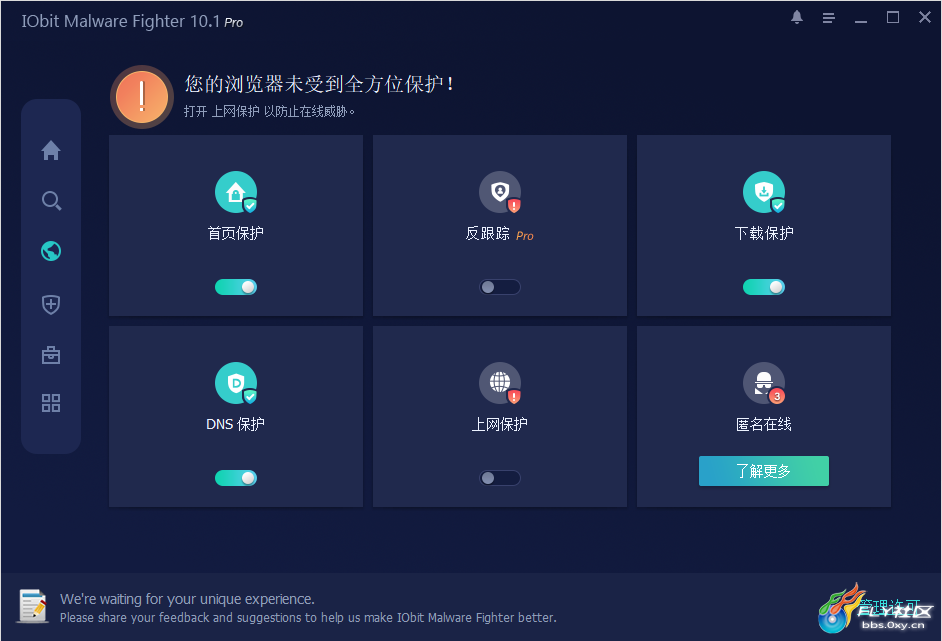 IObit Malware Fighter Pro具有独特的“双核”反恶意软件引擎,IObit Malware Fighter Pro还集成了创新的云计算技术,反应更加轻快,全面的实时保护,包括:启动防护,浏览器防护,网络防护,文件防护,Cookie防护,进程防护,U盘防护和恶意动作防护等。大眼仔旭在这里提醒一下,IObit Malware Fighter Pro 不是杀毒软件,不要当作杀毒软件来用,其查杀率和病毒清除能力还是比较有限的,当做一款杀毒软件的补充,一款安全辅助软件来用比较合适。