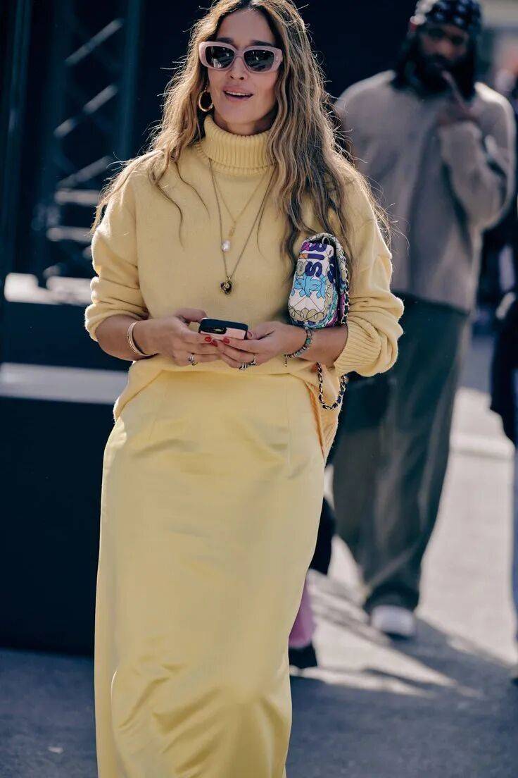 或者上半身暖黄毛衣,下半身浅黄长裙,靠深浅分出层次。