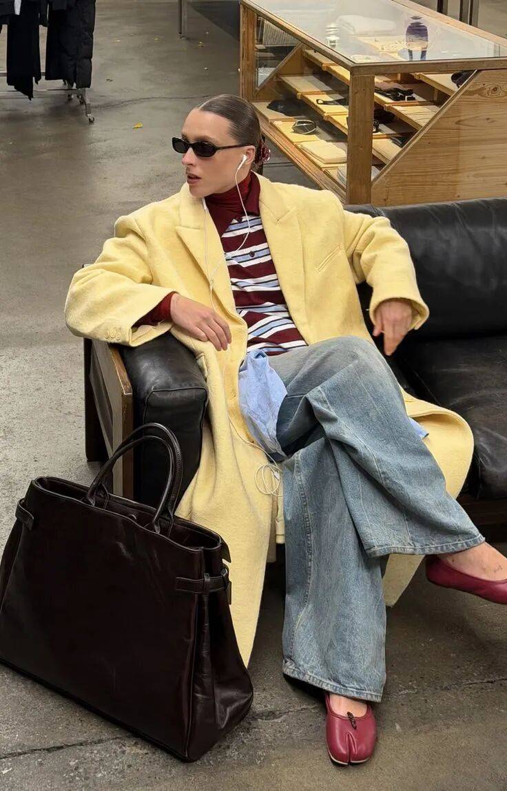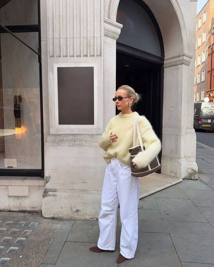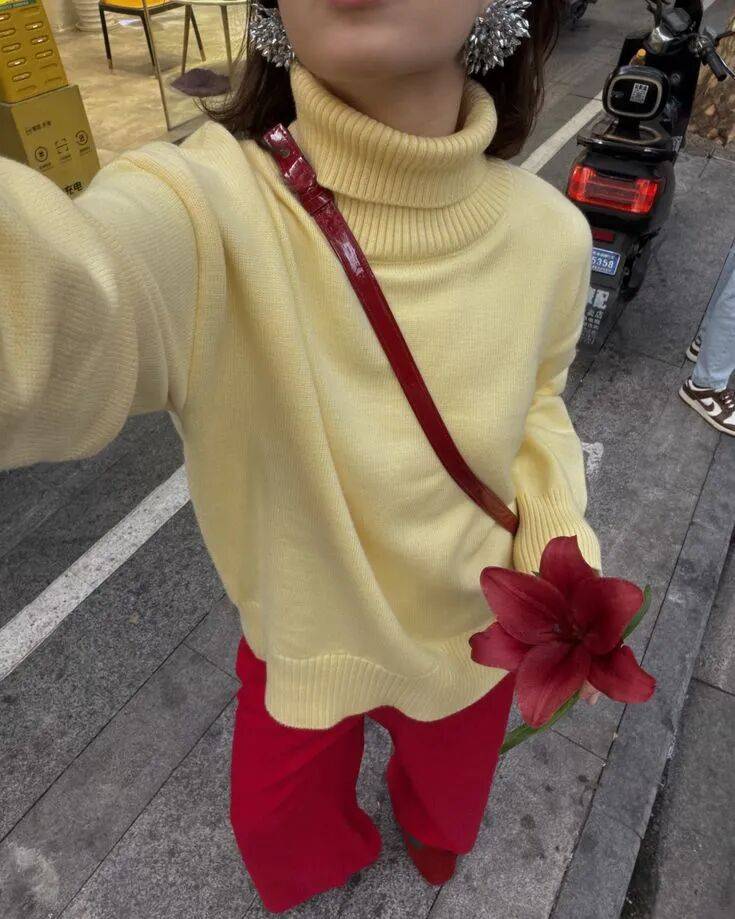 或者让白和黄各占一半,上半身鹅黄色毛衣,下半身乳白色长裤,靠深浅分出层次。
