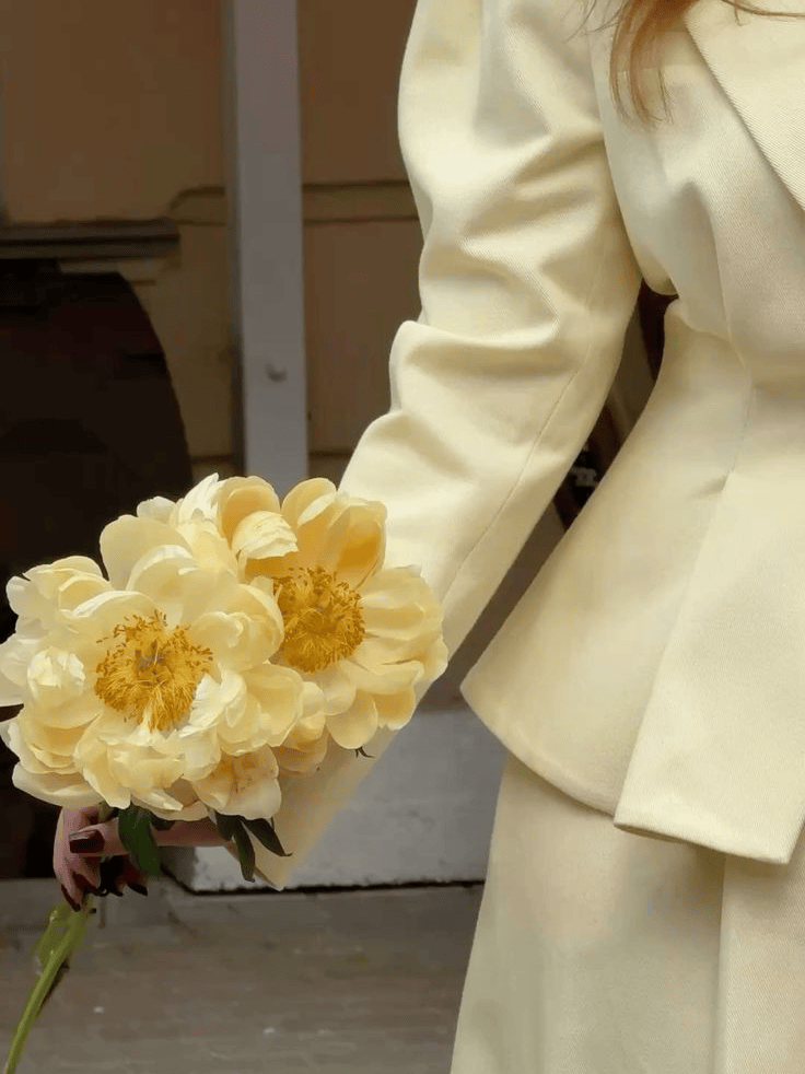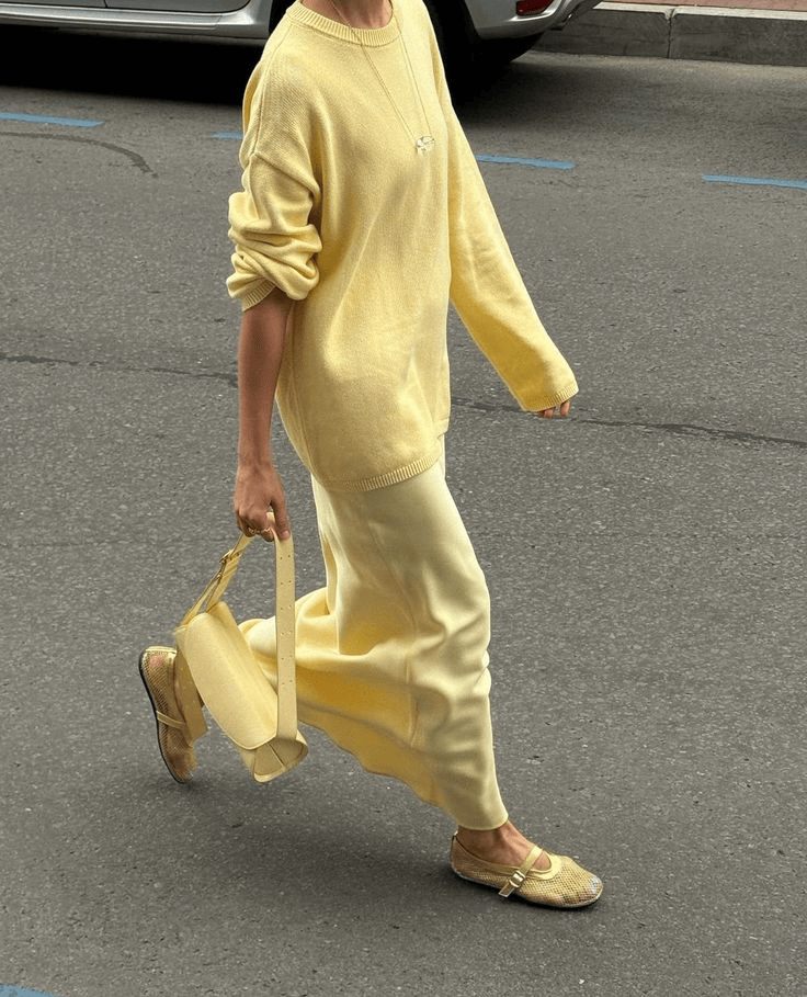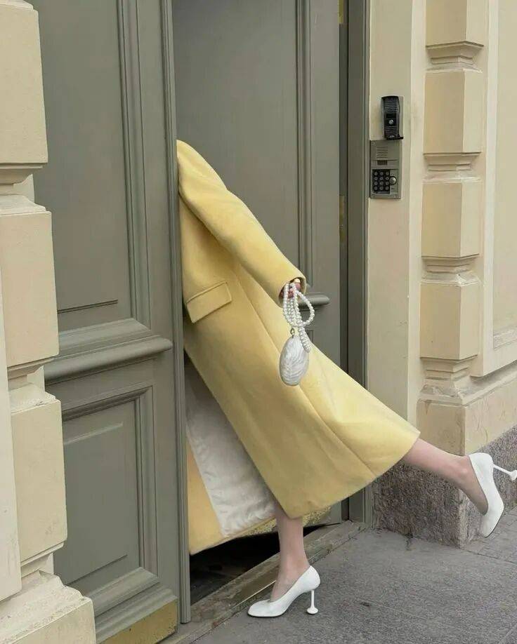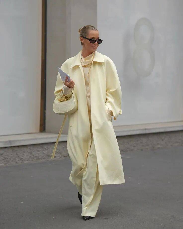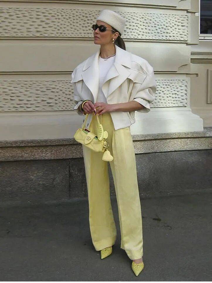 想要更含蓄些,就一身米白打底,只在内搭或者配饰上选一抹鹅黄,点到为止。