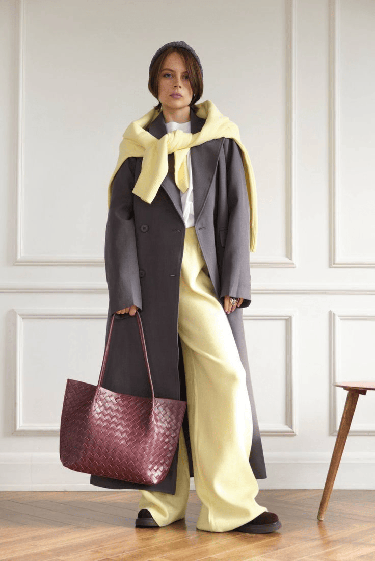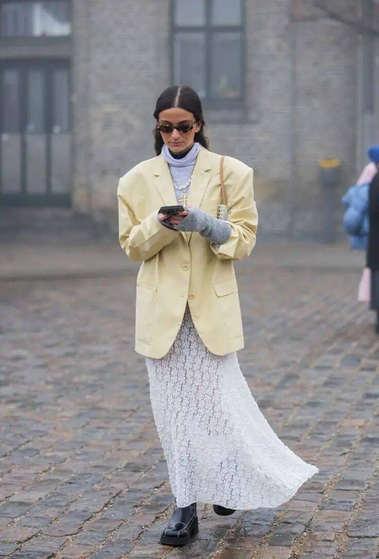 材质也得跟上,粗纺的厚实、真丝的轻薄、针织的柔软,凑在一起才有看头。