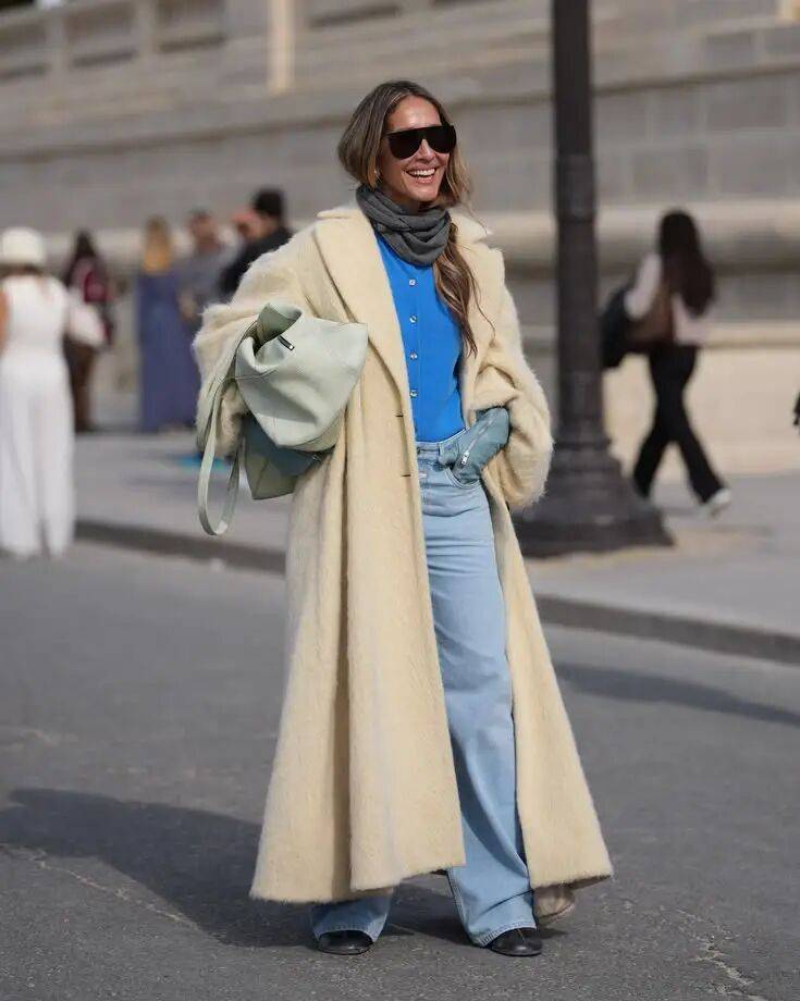 或者蓝色只做点缀,米白色的大衣内搭穿上一身干净的蓝色调。