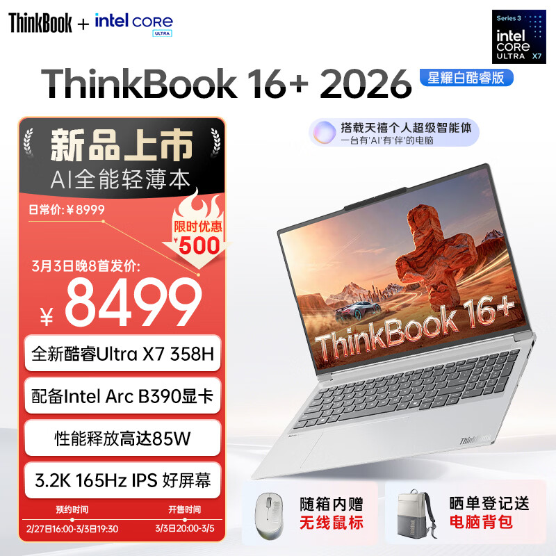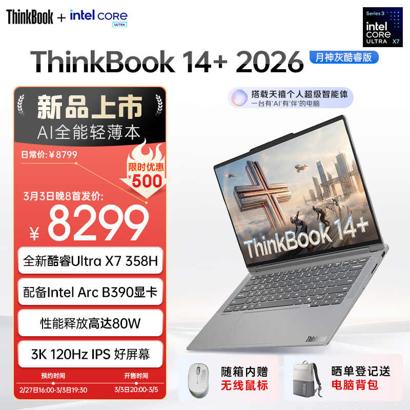 2 月 27 日消息,联想 ThinkBook 14+ / 16+ 2026 酷睿 Ultra 版 AI 元启全能轻薄本 (ThinkBook G8+ IPH) 现已上架开启预约,3 月 3 日 20:00 正式开售。