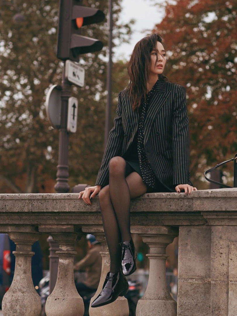 看了张钧甯的活动造型,我们再来看看张钧甯巴黎时装周的看秀造型吧!黑色的条纹西装搭配黑色丝袜,给人一种职场干练女强人的感觉。张钧甯脚上搭配的是一双黑色的尖头皮鞋,很好地修饰了张钧甯的腿部线条,行走的画报又在散发魅力了!