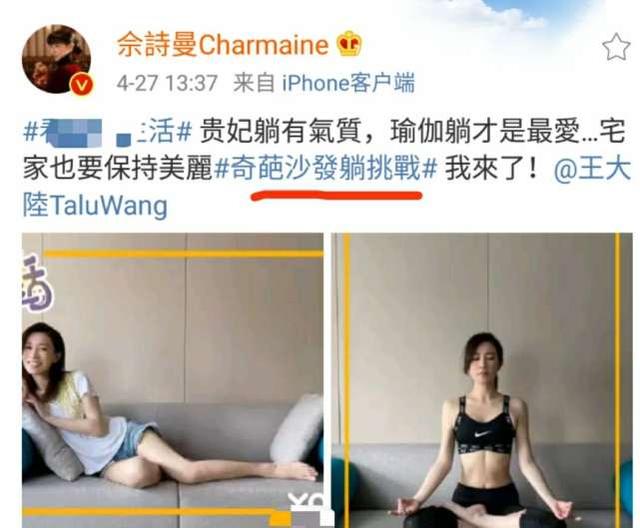 4月27日,佘诗曼又在网上晒出两张自己的近照,还响应王大陆的“奇葩沙发躺挑战”,自夸自己的“贵妃躺”有气质,而瑜伽躺才是最爱,并表示宅在家里也要保持美丽!有事没事就在家练练瑜伽,总算明白人家的“不老”不是白来的啦。
