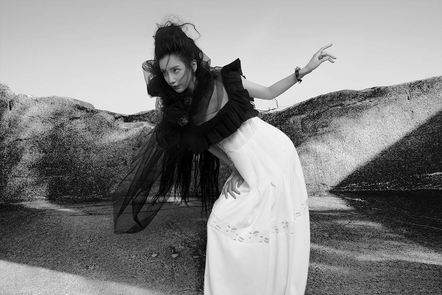 Angelababy登封杂志四月刊Angelababy风格突破Angelababy蜂窝头及腰长发 在希腊风格的断壁残垣中,广场上铺设的蓝色绒毯如同汪洋大海一般,而身穿黑色纱裙的baby就是在“海面”上被唤醒的沉睡魔女。身旁枯萎的玫瑰,增添失落氛围。高耸的蜂窝头及腰长发与鹿角般的发饰,散发着神秘感。皮质短上衣和印花长裙造型,别有一种另类野性的美。Angelababy哥特风大片Angelababy魅惑迷人Angelababy诠释另类之美 由Angelababy担当常驻嘉宾的《奔跑吧》第九季正式官宣,4月23日20点20分正式开播,期待这一季baby的精彩表现!Angelababy时尚表现力不俗Angelababy演绎黑童话魔女 Angelababy杂志时尚大片