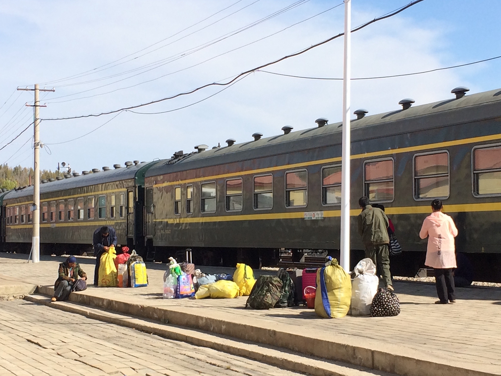 太阳升起来了,没找到能吃午饭的地方。担心没地方吃饭,昨天在漠河买了面包和水带了过来,就在小公园里吃了。吃完后回到车站等买回程的车票。售票室和候车室共用一间很小的房子,有一个窗口,墙上挂着通知牌,标明11:00开始售票。墙边2处摆了7张椅子。站台上已经有几位老乡在等车。我们乘坐来古莲的这趟车就是回程的车,终点是齐齐哈尔,