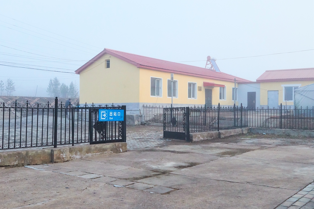 我们到了古莲下车后,大雾弥漫,辨不清方向。车站的站台上有一个铁围栏,有个开着的围栏门,旁边挂个《出站口》的牌子。站台只是名义上定义,没有建筑物,就是在铁轨旁边将地面进行了硬化,铺了一段地砖。车站边上有一片废弃的住宅平房,不知是原煤矿职工的宿舍还是其他单位的宿舍,个别房子里有人居住,原来的院落都成了菜地,只有小道供人行走,有人在挖土豆。