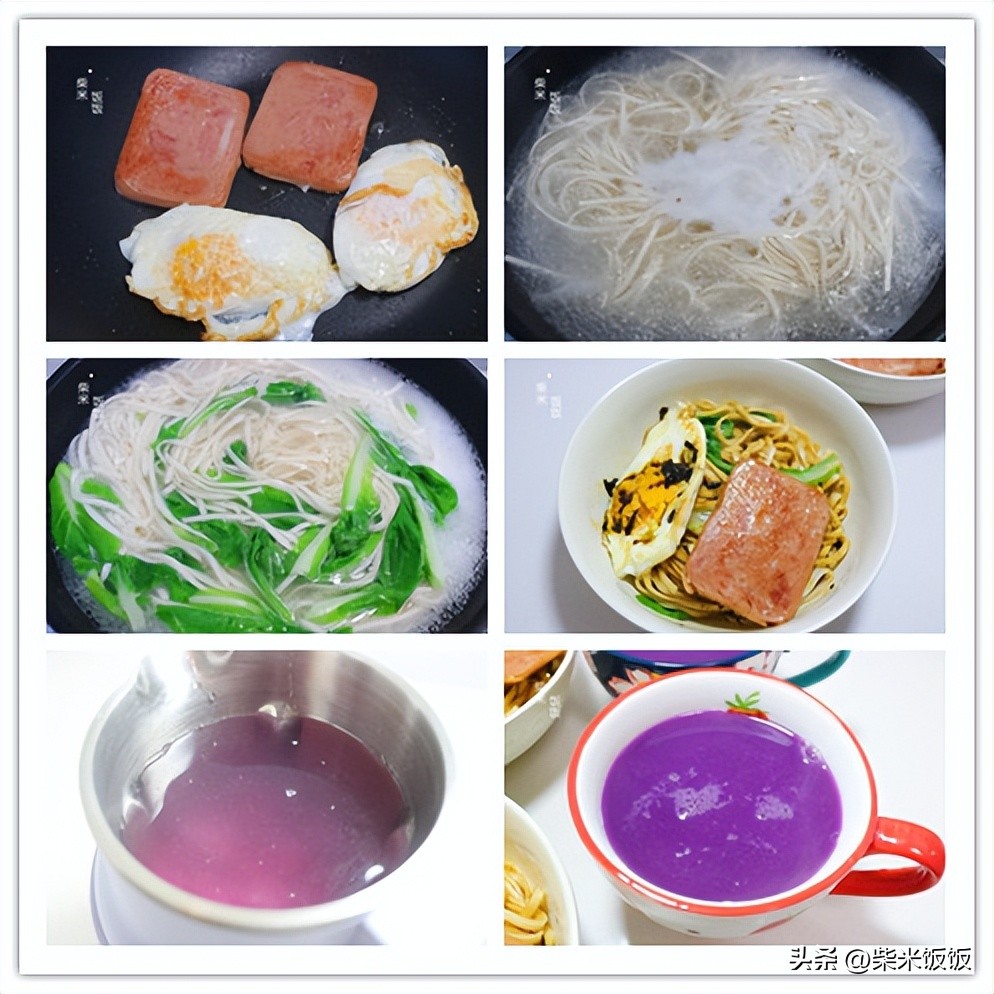 家里有上学娃,每天都要在家吃早餐。分享我最近做的七款早餐,好做好吃,喜欢的朋友可以参考。 周一,芹菜牛肉包子、南瓜米糊、大豆素肉芹菜牛肉包子:①牛肉切小块放绞肉机里,加盐、老抽、生抽、葱姜花椒水,绞打成肉馅。放入芹菜碎、熟油,放冰箱冷藏,第二天早上起来再搅拌均匀。②400克面粉、4克酵母、210毫升温水,揉成光滑面团。密封后放冰箱冷藏发酵一晚,室内温度低就不用放冰箱。③早上起来面团不用揉,揪成小块,捏扁,放入馅料捏成包子。④温水锅里醒发十分钟就可以蒸,水开计时蒸15分钟,焖2分钟即可。 南瓜米糊:南瓜200克、小米40克、熟花生20克,加600毫升水,打成米糊。大豆素肉:①大豆素肉温水浸泡5分钟。②捞出挤干水,放点胡萝卜丝一起再开水煮1~2分钟。③捞出不用过凉水,加盐、生抽、香醋、味精、香油、香菜,拌匀就好了。 周二,茶叶蛋、肉丝米粉茶叶蛋:①鸡蛋洗干净,凉水下锅煮熟,再用勺子将鸡蛋表面的蛋壳拍出裂纹。②鸡蛋放锅里,加盐、老抽、生抽、茶叶蛋料包,大火煮开,转小火煮5分钟。③关火浸泡一个晚上。④早上起来将鸡蛋煮开就可以了,咸香入味又好吃。 肉丝米粉:①米粉头一天晚上用凉水浸泡。②早上起来烧点开水,放入泡好的米粉,煮2分钟捞出来,再用凉水淘凉,控干水。③肉丝、姜丝、蒜片炒一炒,再加点生抽炒香。④放西红柿炒出汤汁,再加水煮开。⑤放入米粉煮开,再放点生菜,加盐、味精调味就好了。 周三,紫米饭团、西红柿蘑菇鸡蛋汤紫米饭团:①紫米、白糯米2:1混合,加入和平时煮饭差不多的水,头一天晚上预约煮饭。②早上起来米饭煮好了,用铲子翻一翻稍微凉一下。③碗里铺保鲜膜,放上一勺紫米饭铺平整,上面再放肉松、黄瓜、白煮鸡蛋。④最上面再盖上紫米饭,然后把饭包裹好。⑤对半切开,就可以吃了。 西红柿蘑菇鸡蛋汤:①西红柿加点盐、生抽炒出汤汁,然后加水煮开。②放入平菇、豆腐泡、青菜煮一分钟。③淋入鸡蛋液煮开,最后放点盐、味精、香油调味即可。 周四,鸡蛋酱油面、贝贝南瓜鸡蛋酱油面:①碗中放葱花、生抽、香醋、盐、松茸调味料、虾皮、葱头猪油。②水烧到微开打入鸡蛋,小火焖一分钟。③下入面条煮一分钟,再放青菜和豆腐皮。 ④舀几勺煮面的汤把碗里的调料冲开。⑤把面条和鸡蛋捞入碗中就好了。贝贝南瓜放蒸锅里,水开大火蒸8分钟就好。 周五,香煎吐司、萝卜丝煎蛋汤香煎吐司:①一个鸡蛋、100毫升纯牛奶搅拌均匀。②吐司表面裹满牛奶鸡蛋液。③平底锅放一块黄油融化。④放入吐司,煎到表面金黄即可。 萝卜丝煎蛋汤:①煎2个荷包蛋,煎熟切成小块。②萝卜丝加姜丝炒一炒,放入煎蛋,加开水进来,再放入几个牛肉丸。大火煮几分钟,把食材煮熟就好了。 周六:冰花煎饺、南瓜山药米糊、西兰花蒸蛋冰花煎饺:①平底锅烧热,放点油,摆放饺子。②放入100克面粉水,盖上盖子中小火焖煎6分钟。③水蒸干,出现脆底关火。④倒扣一个平盘,把饺子取出来。 南瓜山药米糊:南瓜100克、山药100克、大米20克、红枣3颗、600毫升清水,打成米糊。西兰花蒸蛋:①盘子一周摆西兰花。②盘子中间加生抽、香油、清水,再打入鸡蛋。③盖上盖子,中大火蒸6分钟,鸡蛋熟了就好了。 周日,葱油拌面、紫薯米糊葱油拌面:①平底锅煎鸡蛋和午餐肉。②水开下入面条,快要煮熟时放点青菜煮半分钟。③捞入碗中,加葱油拌匀就好了。 紫薯米糊:150克紫薯、25克大米、600毫升清水,破壁机打成米糊。 大家好呀,我是饭饭!喜欢厨房,喜欢做饭,用一日三餐来记录平淡的生活。