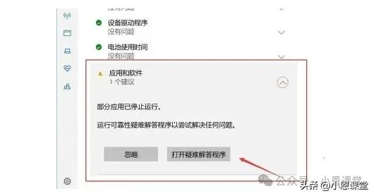 1、点击“应用和软件”功能,之后选择“打开疑难解答程序”;