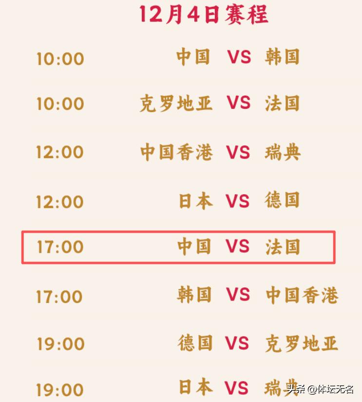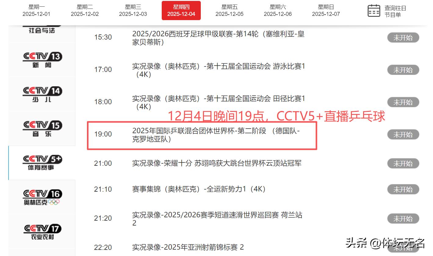 中央5台的直播安排相比上一个比赛日也有调整!昨天国乒的比赛,由CCTV5+进行转播,而到这个比赛日,中韩大战和中法大战,都是由CCTV5全程直播。据央视节目单,在12月4日下午17点00,CCTV5继续转播国乒和法国的混团比赛,球迷们记得准时收看,支持中国队!