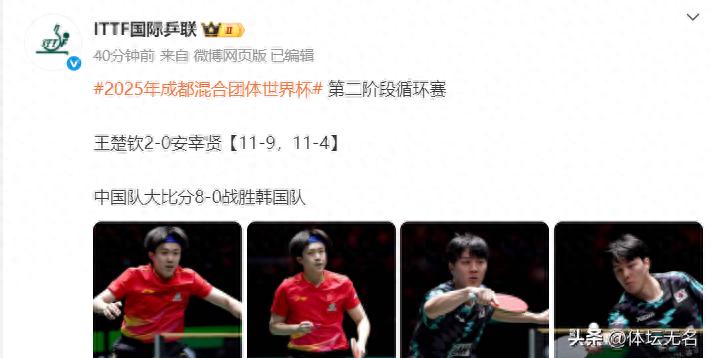 北京时间12月4日,乒乓球混团世界杯第5个比赛日,第二阶段的比赛继续进行!在今天上午结束的一场比赛中,国乒8-0轻松击败韩国。本场比赛,教练组继续变阵,林诗栋/蒯曼搭档混双,王曼昱出战女单,王楚钦男单,没有太大悬念,三盘比赛全部横扫,不给韩国球员一点拿分的机会!