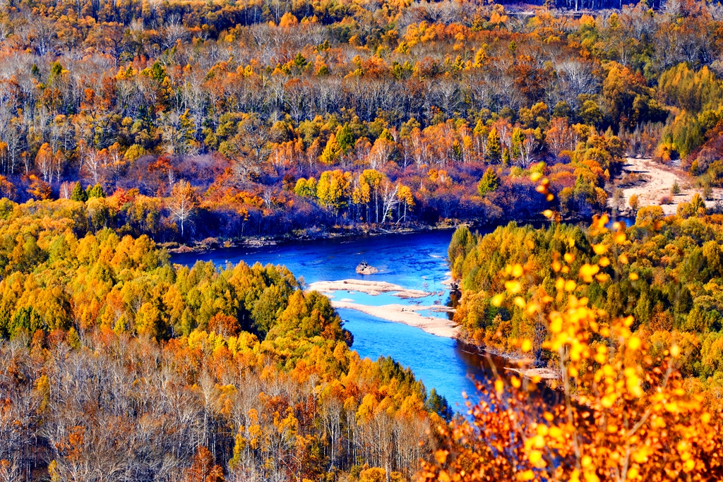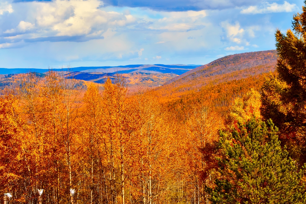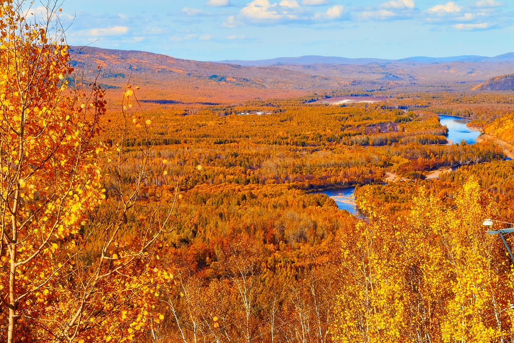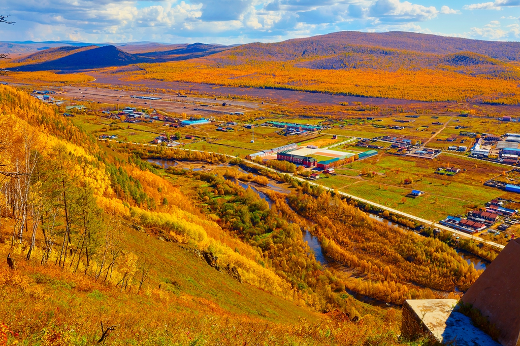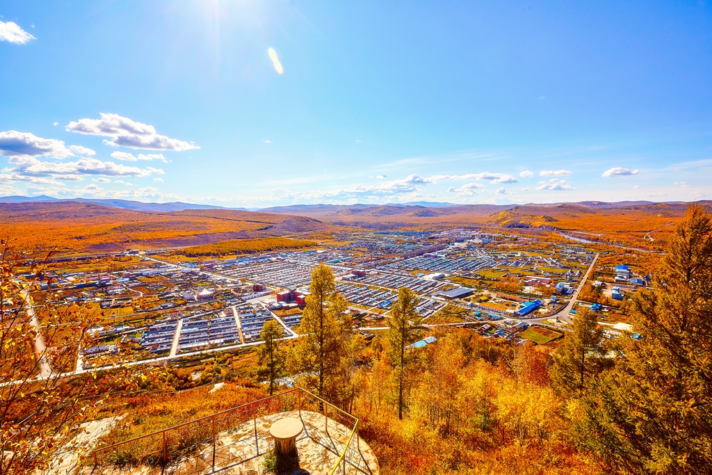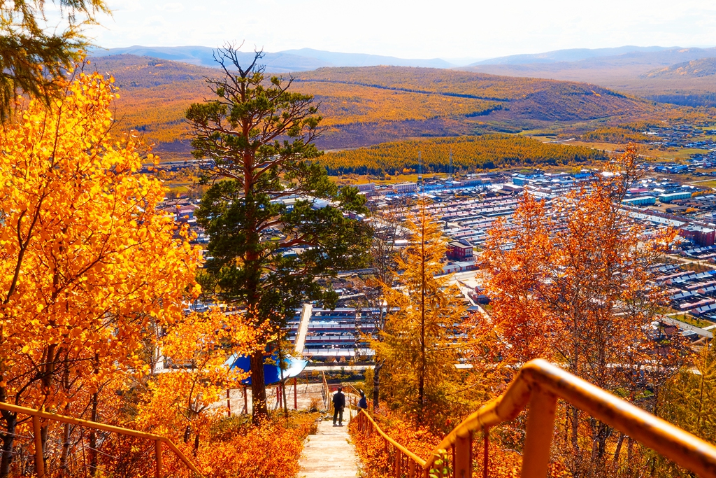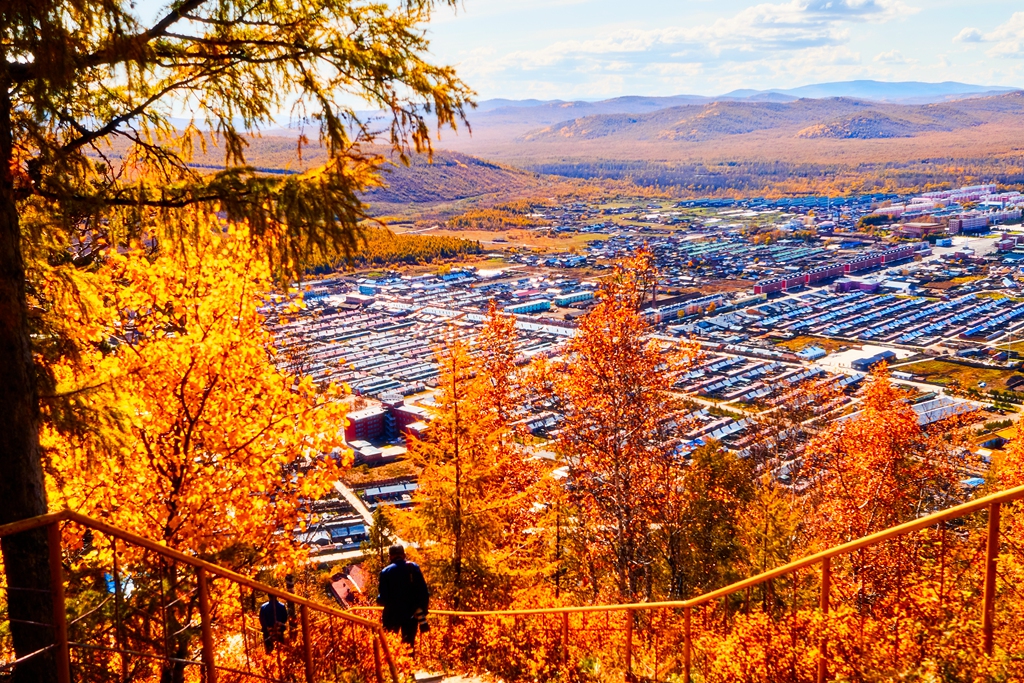 进入满归后就见到了凝翠山,老伴感到亲切。当年部队搬迁,到达满归正值夏至前后。部队搬迁事情很多,每天很忙很累。老伴还是放弃休息坐到凝翠山的山坡上,看到了满归的不夜天。现在凝翠山南坡修了栈道,北坡有公路可上山。小张把车一直开到了山顶上,山顶上建有满归电视台。有一处观景楼,站在上面,满归全景尽收眼底。浓郁的秋色中,烂漫旖旎。南坡建有可徒步上山的栈道,小张带领我下到一个平台上看了看。