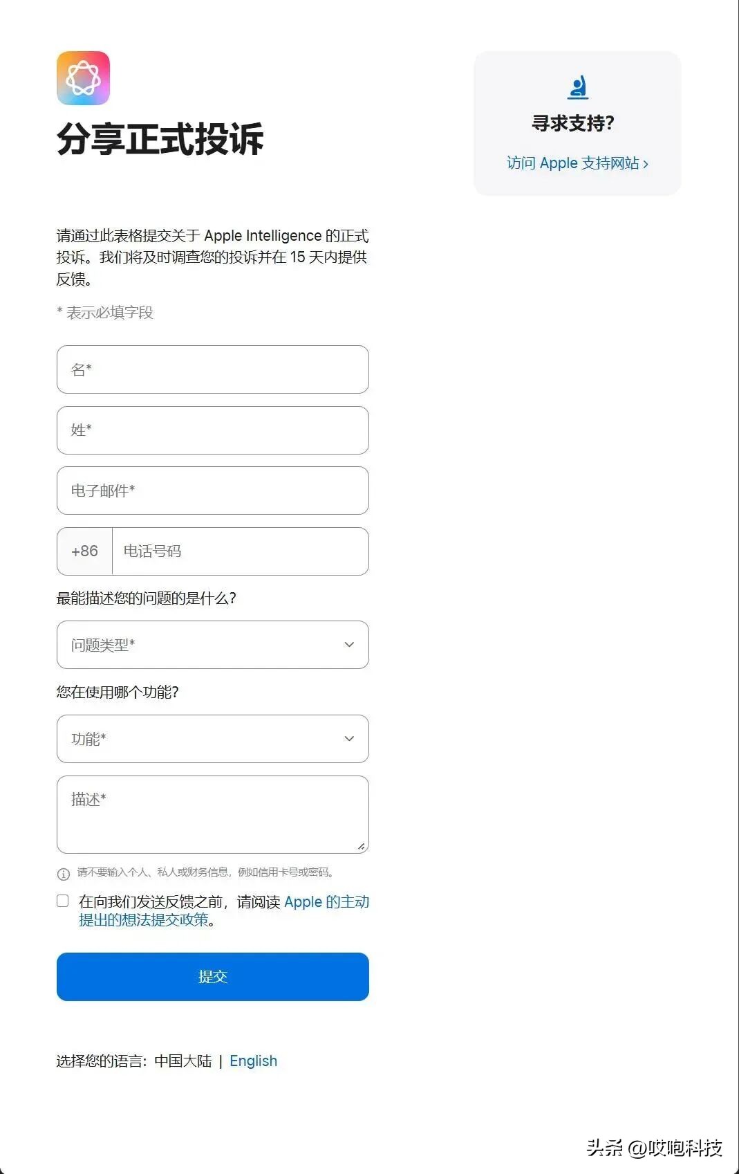 手机号并描述功能相关问题。反馈范围涵盖写作工具、照片消除、通知摘要等多个 Apple Intelligence 相关功能,同时也包含内容表现、隐私处理等方面的体验问题 。