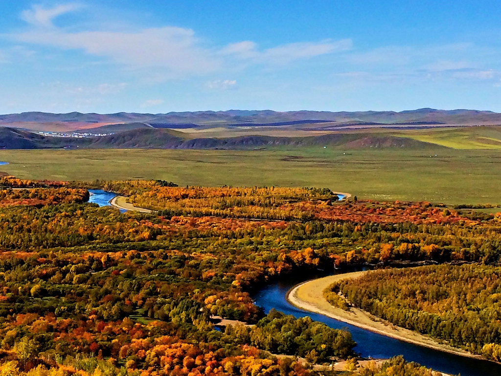 9月20日一大早,就起床到酒店对面不远处的额尔古纳湿地售票点买去湿地游览的公交车票。临行前在家里通过百度知道了有大巴车往返景点,很实惠。买好票以后大巴把游客集中到客运站,8:20发车。我在客运站安检时抓紧时间到超市买了2个大列巴面包,每个10元。天很晴,气候宜人。海拉尔到拉布大林(额尔古纳市)130公里,大巴车近2个小时。在额尔古纳市有出租车到湿地景点,车费6元。下车后马上打车前往湿地,已经是淡季了,门票20元。进去后有工作人员招呼乘电瓶车,车费15元。我想步行,边游览边拍摄,能够跟好的感受湿地风光。可工作人员喊:“你们老人走不动,很远的。”老伴问了一句“多远?”“有7.5公里哪,不乘车到不了”。一听到公里数,我和老伴心里也有数了,这点路程对我们一点也不困难。