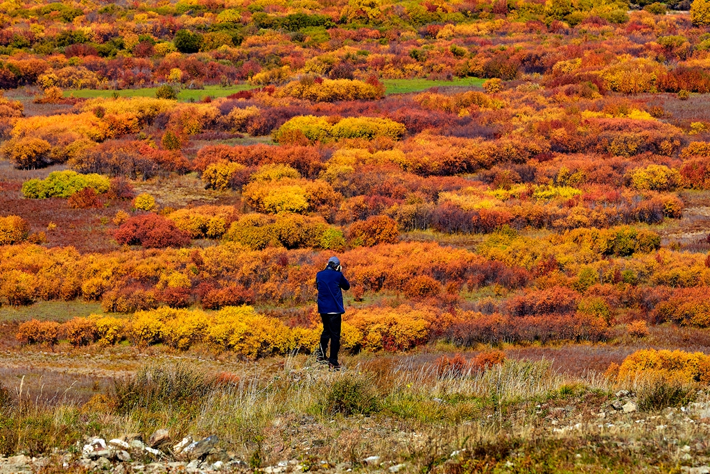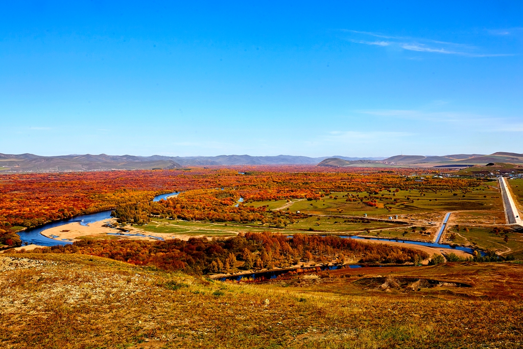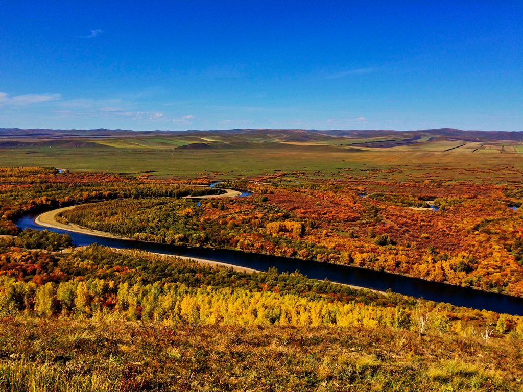 进门先是上一个大坡,到了坡上面就看到了额尔古纳博物馆,建筑很有特色,就过去拍了几幅照片。若是乘电瓶车,走的是另外一条路,博物馆很多人会看不到。沿着博物馆的台阶向上,是一个还没有建设好的观景台。观景台的拍摄角度很好。下面还有一个很大的渣土平台,,也类似一个观景台,可以看到下面河中的全景,能够从南向北拍摄湿地。湿地公园特别壮观,秋色浓郁,色彩丰富,那种震撼的感觉无法确切形容。在观景台上拍了很大一阵,下山后过一条马路就是上山的栈道。栈道修的很结实,在山坡上下曲折的缩小坡度,行走很安全。一会儿就到了最高处,整个湿地公园一览无余。对于喜欢摄影的人来说,秋季的额尔古纳湿地才是最好的季节,丰富的色彩赋予了拍摄的极大乐趣。