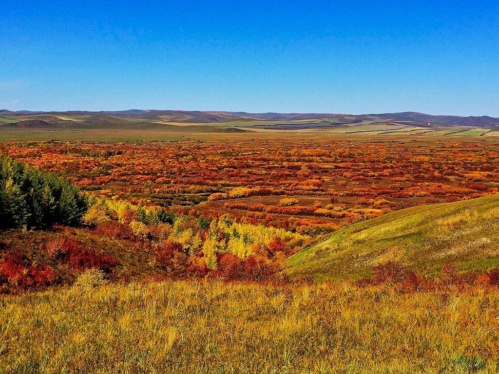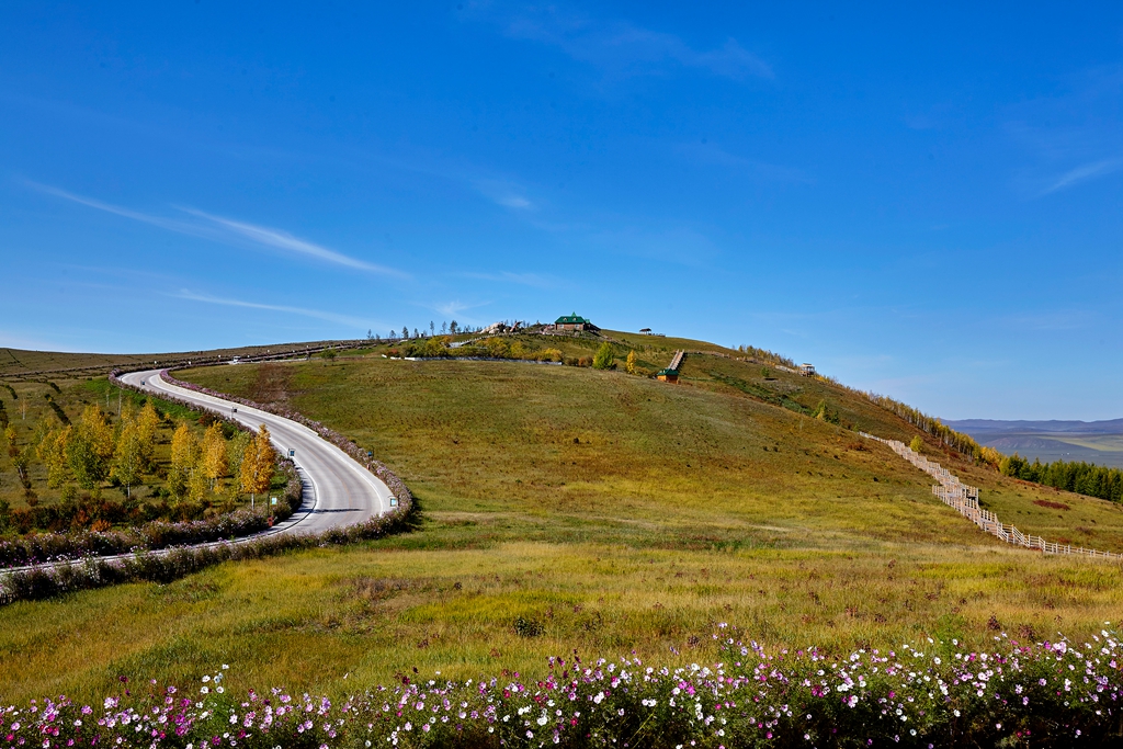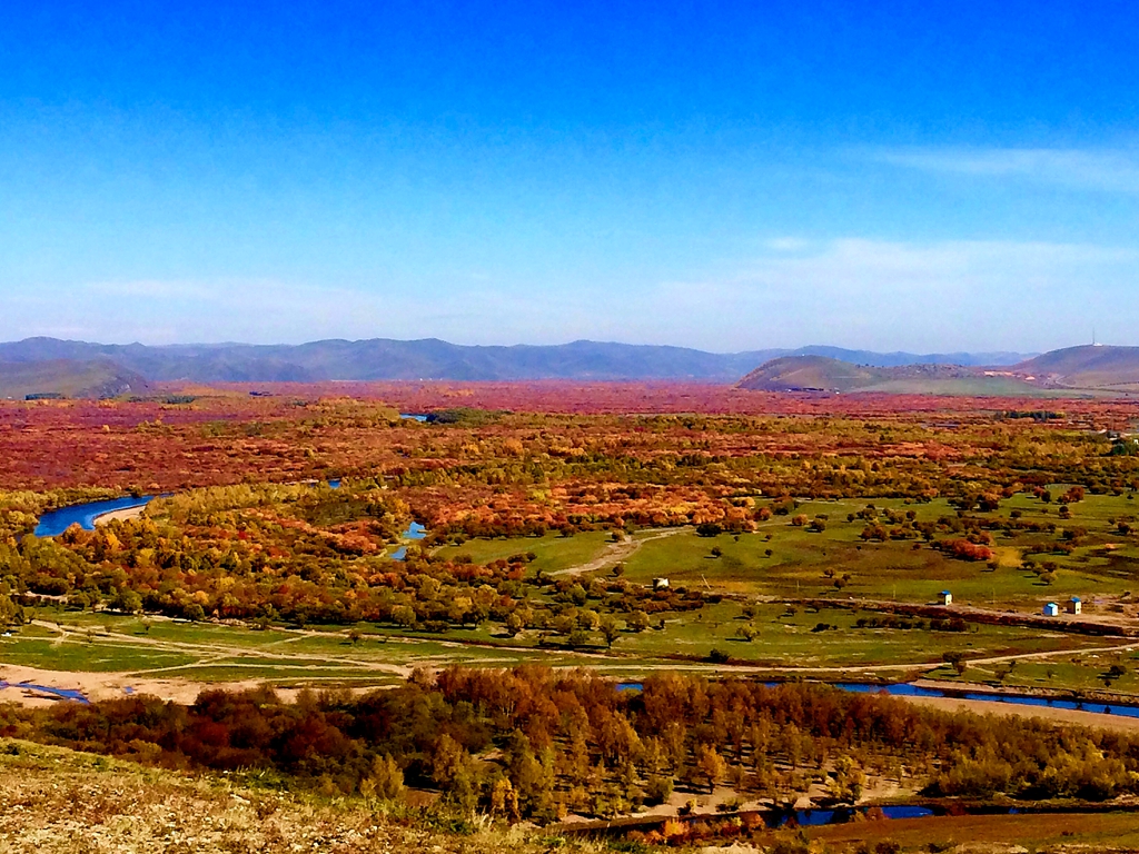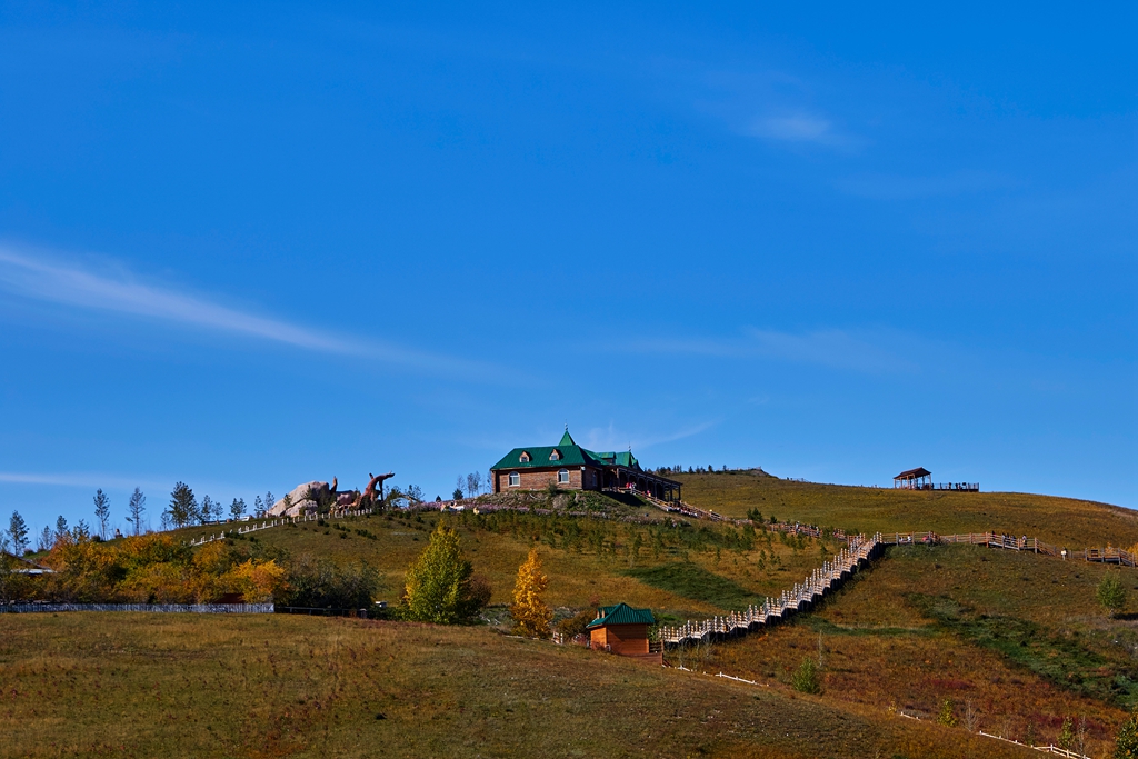 在亚洲第一湿地的景观石旁拍了一副纪念照,游览了栈道所有的可到之处。拍摄、摄录了很多照片视频。山顶上的娱乐项目都已经关闭了,12:20,在游客中心的椅子上开始吃带去的面包,用游客中心的热水冲了一杯速溶咖啡,可能是有些饿了,觉得面包真好吃。吃完后开始走下山,14点走出了公园大门。从10:27拍下第一幅照片,共游览了3个半小时,特别酣畅。还是6元打车到拉布大林客运站,买了回程的车票。15:05分发车,往返车票都是每张38元。到海拉尔后,天已经黑了。在车站前的饭店转了转,找到了一家比较大的饭店,吃了米饭炒菜。回到酒店后继续拍了几幅夜景,就充电清洁相机镜头等打理完休息了。