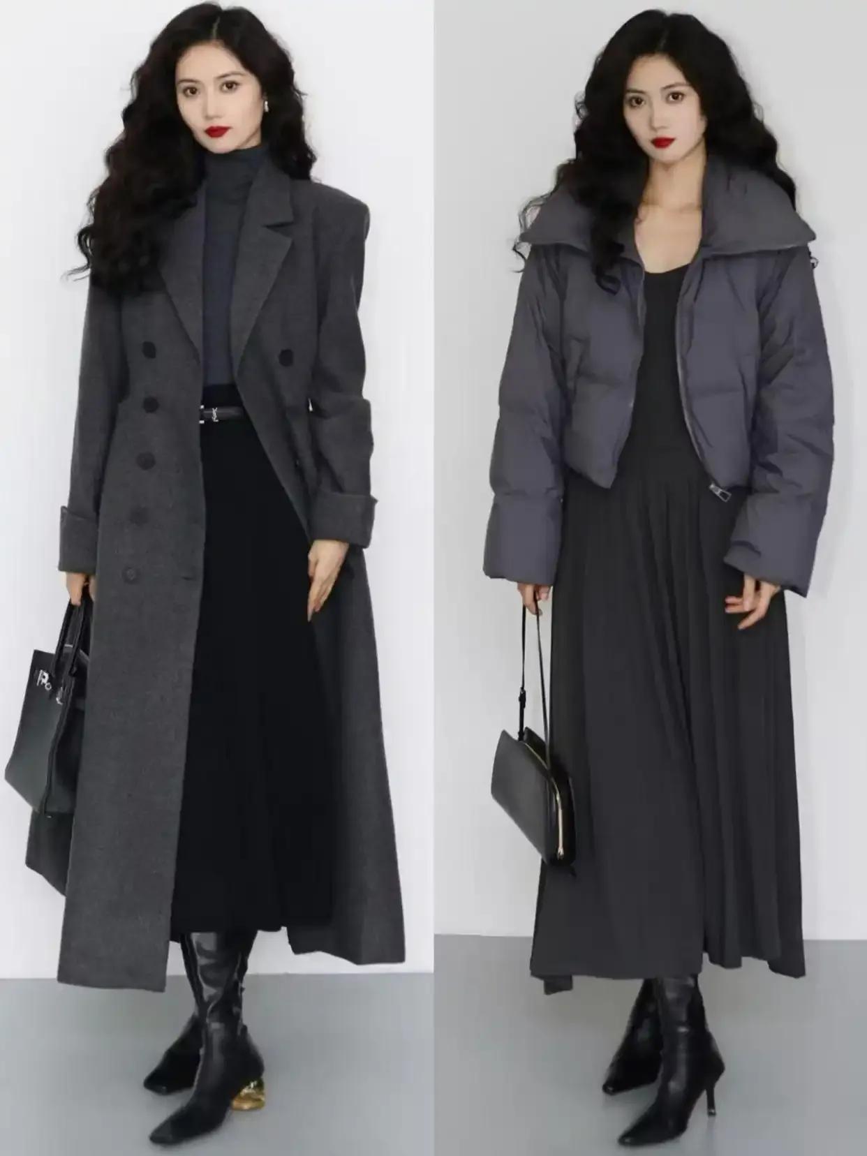 或者咱们可以采用极简的搭配方式,用短款的灰色羽绒服搭配上灰色的连衣裙,就要穿黑色的高跟中筒靴,也可以用灰色大衣搭配黑色半身裙和黑色的中筒靴。这样的配色,谁穿谁美。
