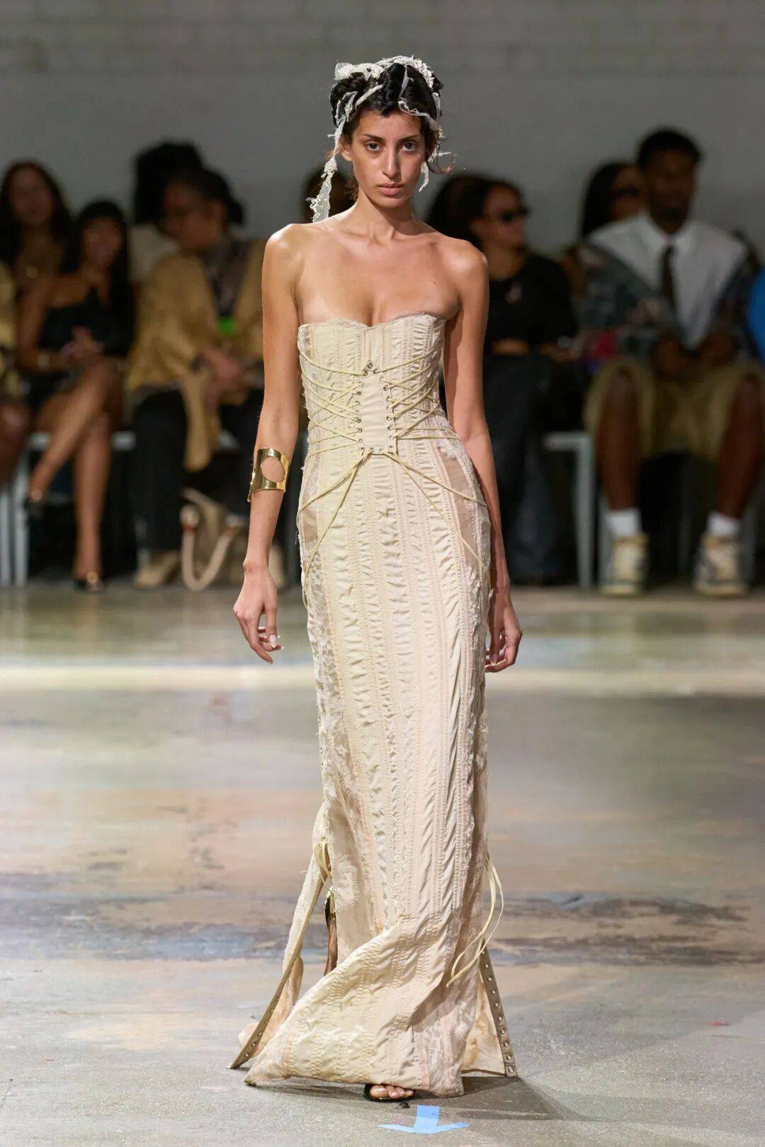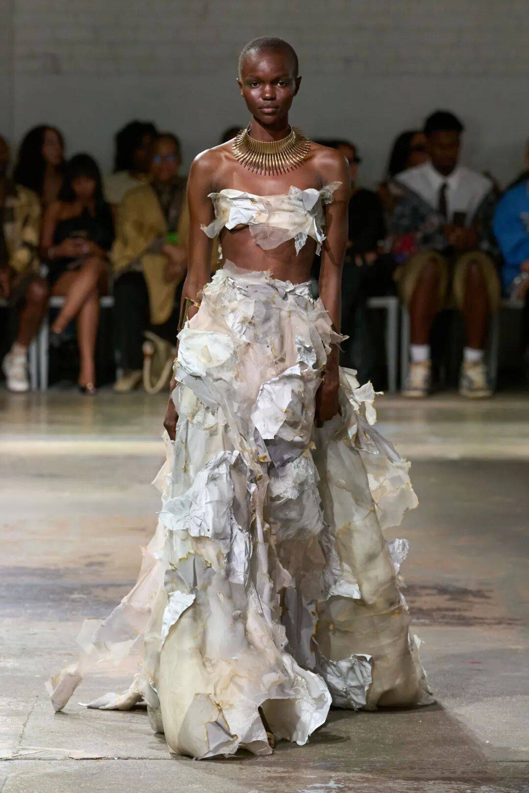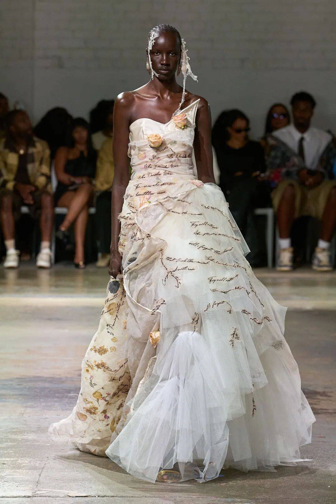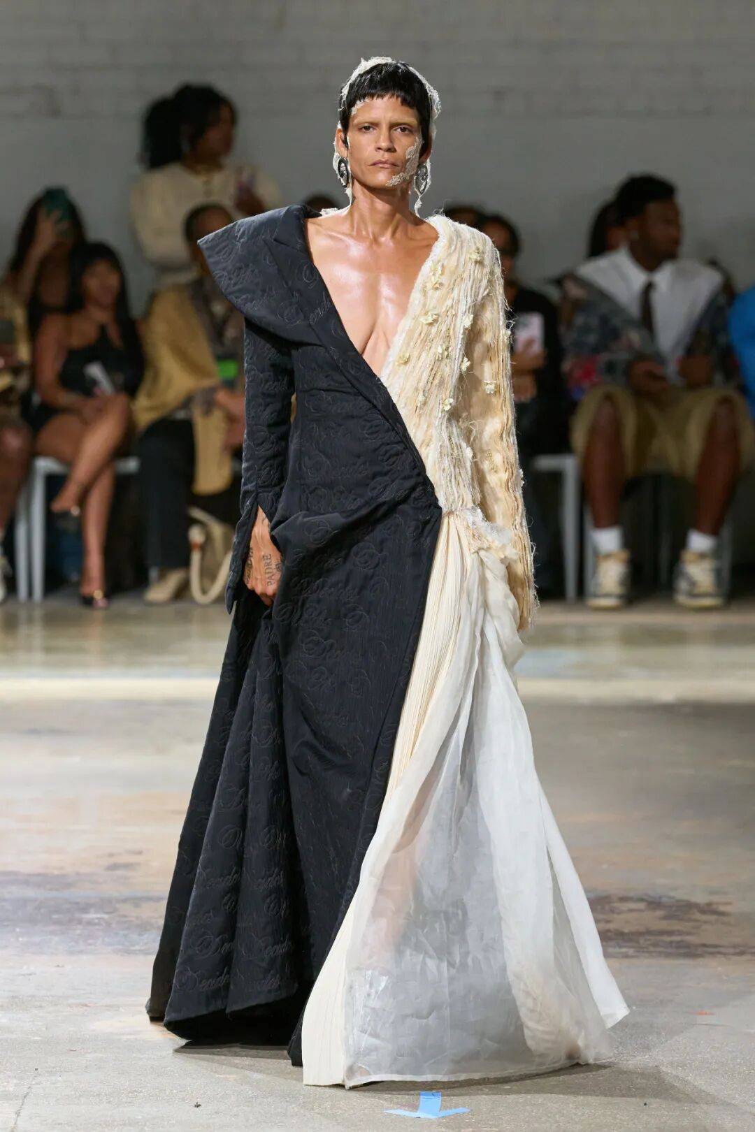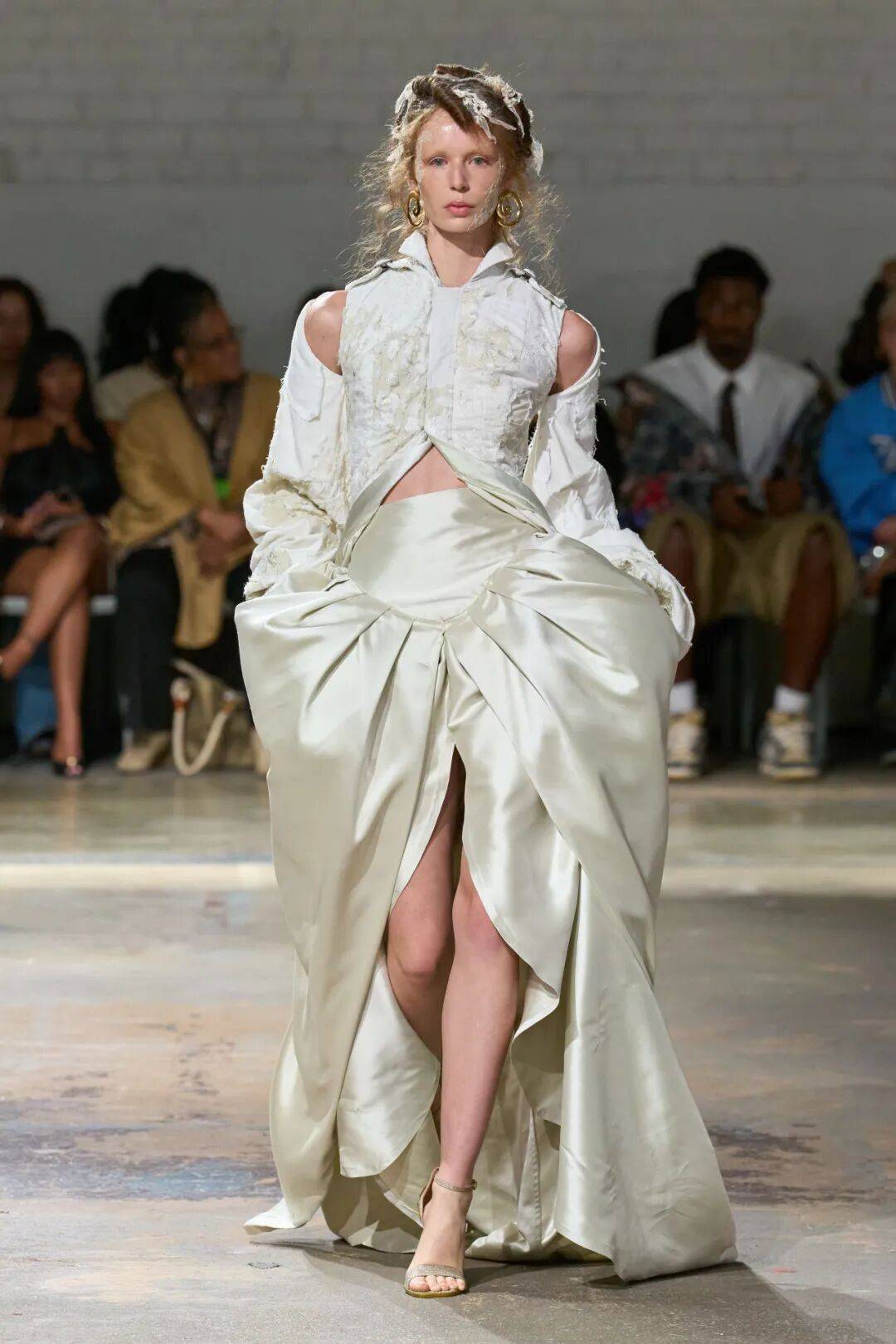Who Decides War 2026春夏系列"Read the Room"通过材质实验与叙事性设计,呈现了一场关于"毁灭与重生"的视觉盛宴,不仅延续品牌标志性的解构美学,更在剪裁与女性表达上实现突破。这场融合哥特美学与街头精神的秀场,成为纽约时装周上探讨"时代精神"的重要篇章。