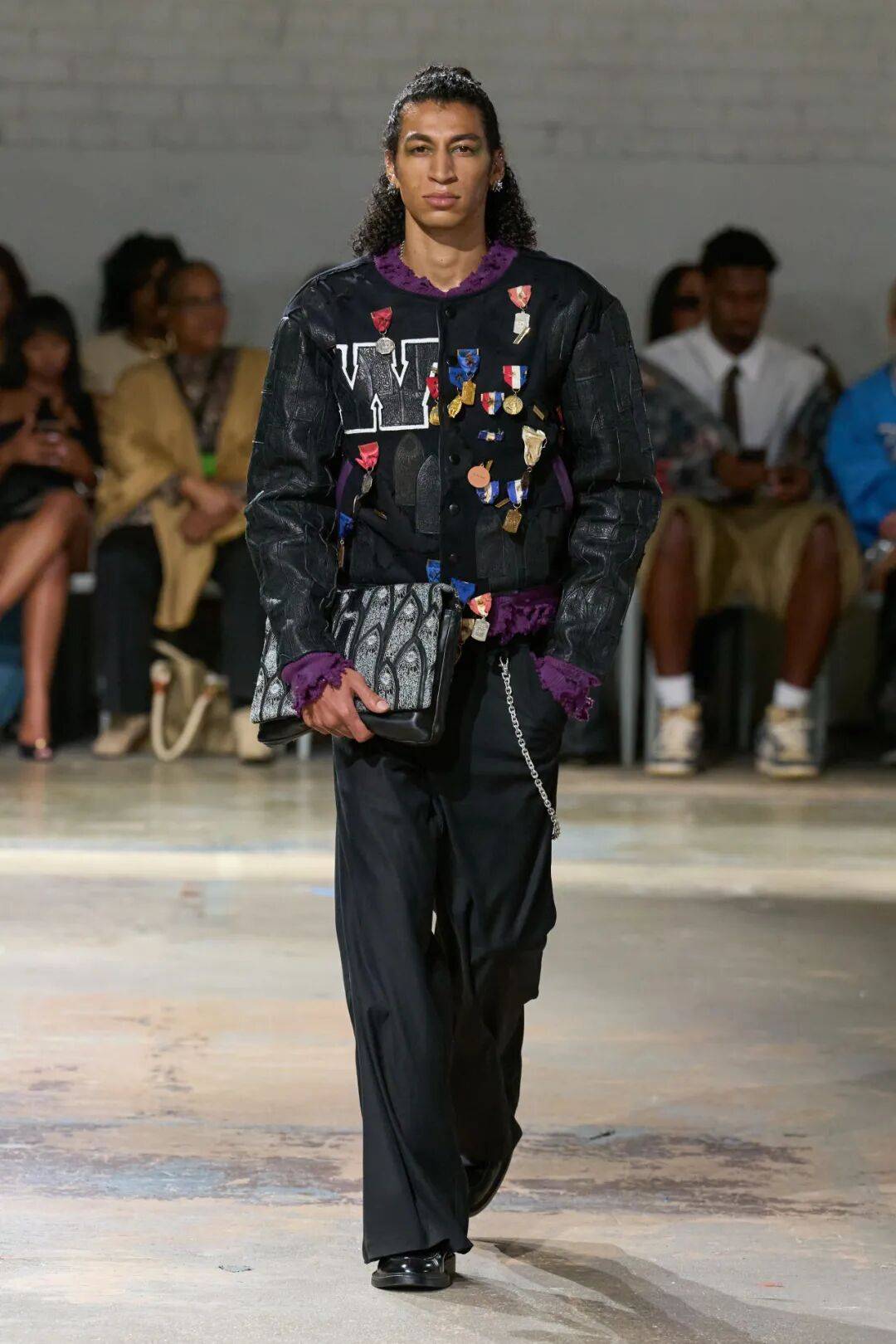 黑色的夹克上衣在彩色的装饰多图案细节的亮点 ,而紫色内搭的搭配,则在视觉的对比有鲜明清晰的层次。