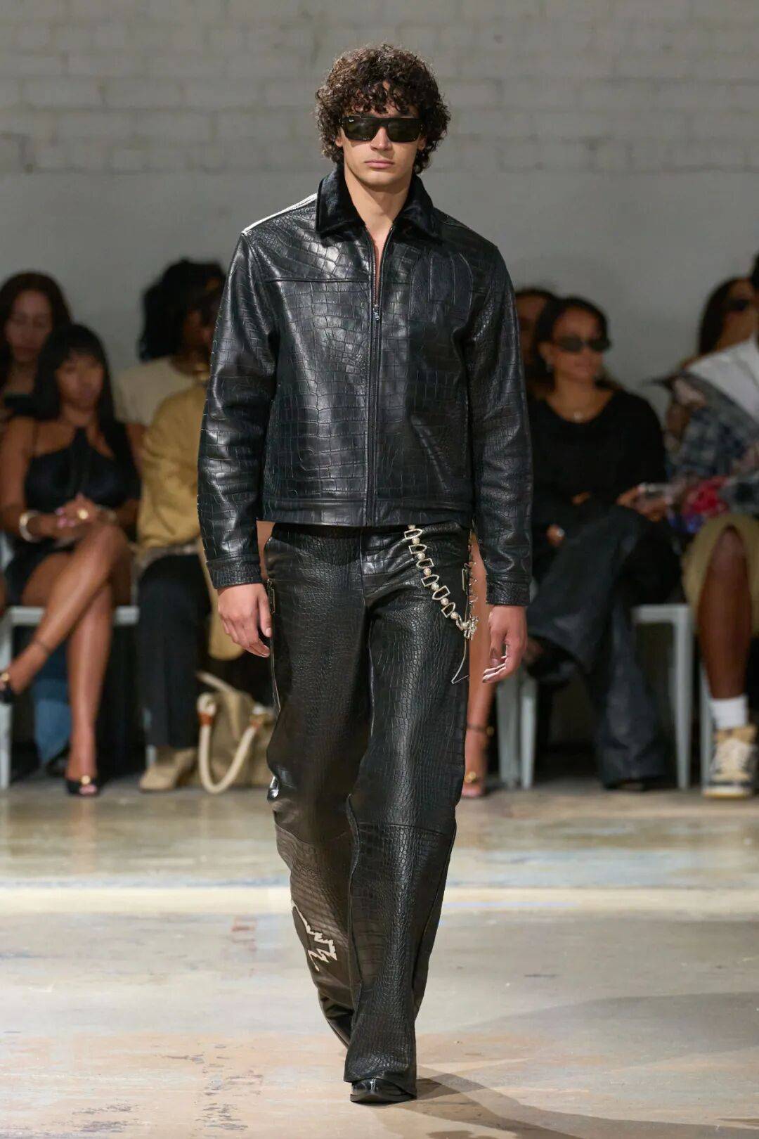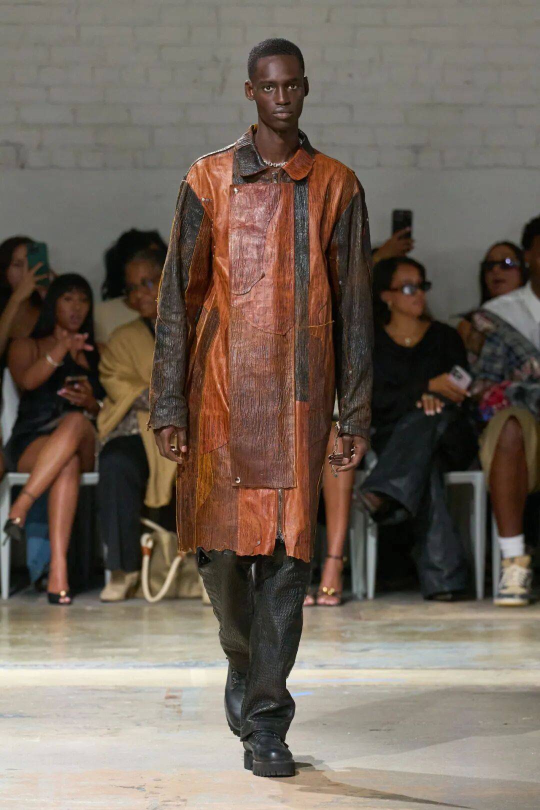 光滑皮革材质的服装在质感的纹理中,宽松长款的大衣在直线的线条上,气质利落舒适也带着几分拼接冲击的对比感。