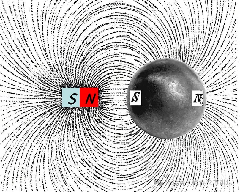 这个动态磁场是怎么产生的?这就像你拿一个动来动去的磁铁,不管磁铁怎么放,都能吸住旁边的铁球。原因是铁有一种特殊的性质,放在磁场里会产生一个和原来磁场一模一样的极性,比如这个磁场是南极、北极,这个铁也会产生一个相同方向的南极、北极,所以铁的南极和磁铁的北极就一直靠在一起、相互吸引。当这个磁场运动的时候,铁产生的磁场就会动,因此,运动的磁场能让铁也产生一个运动的磁场。