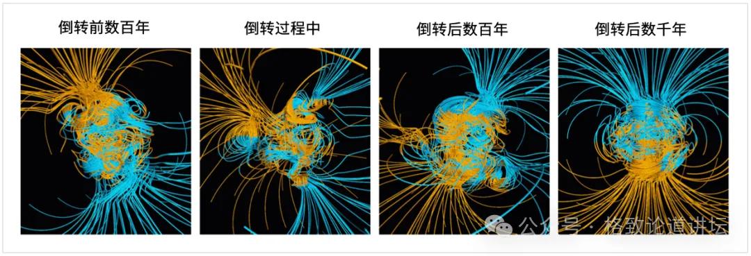 地球磁场是不是一直能够保护我们呢?不一定。地球磁场有一个很重要的现象,叫地磁反转。每隔一两百万年,地球磁场的南极和北极就会在1000年的时间里渐渐对调。在发生反转的1000年时间里,磁场的强度会急剧降低,还会产生偏离偶极场的小尺度结构,从而不再是一个偶极场,而是四级场、八级场。