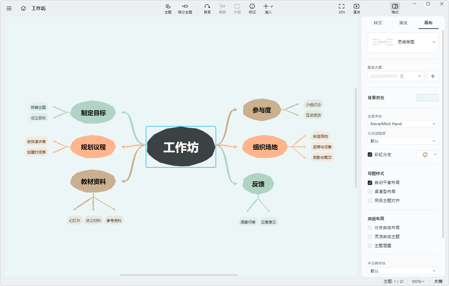 提供了丰富的主题模板,涵盖了商务、教育、创意等多个领域。这些模板具有不同的配色方案和样式风格,用户可以根据具体需求和使用场景快速选择合适的主题,使思维导图在视觉上更加美观和专业。