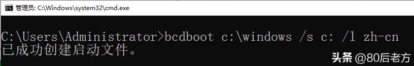 "这是因为BCD中的设备顺序乱了。"我告诉他修复方法:"bcdboot c:windows /s c: /l zh-cn"