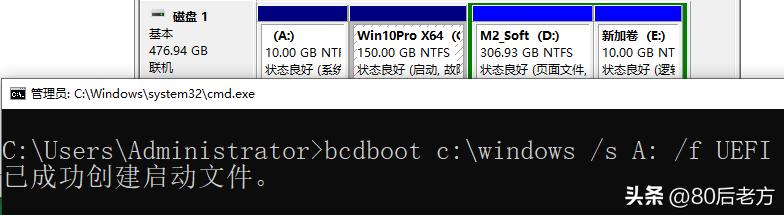 "用这个命令:"bcdboot c:windows /s A: /f UEFI"