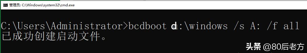 3. 输入:bcdboot d:windows /s A: /f ALL