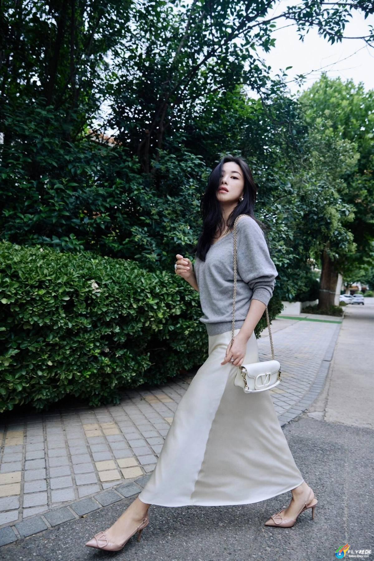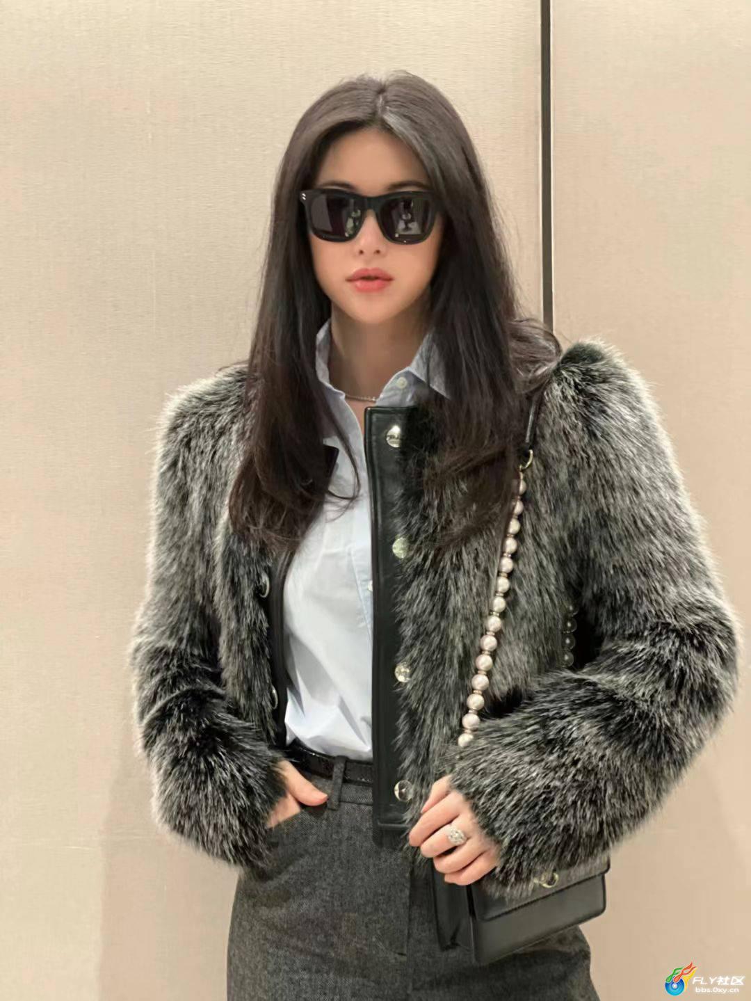 最让我惊掉下巴的是第四张!灰色皮草外套配白衬衫,居然戴了副黑色墨镜,秒变「大佬的女人」!珍珠链条包斜挎在肩上,长发随意披散,这气场走在街上不得被保镖围三层?但她偏偏又穿了件乖乖女的蓝白衬衫,这种混搭感简直绝了,又甜又酷说的就是她吧!