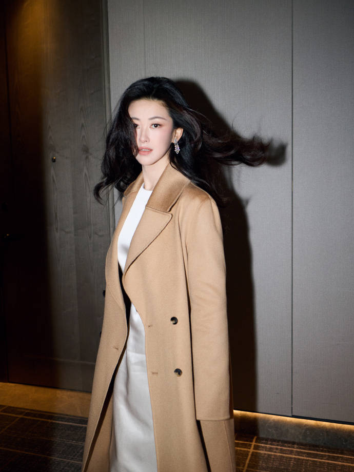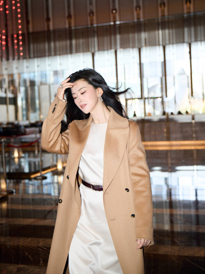 驼色大衣和白色连衣裙,虽然都是简单的基础款,但搭配在一起,加上朱珠干净的妆容,大波浪卷发,标志性的笑脸,这套穿搭就变得高级而又鲜活,美得很生动。