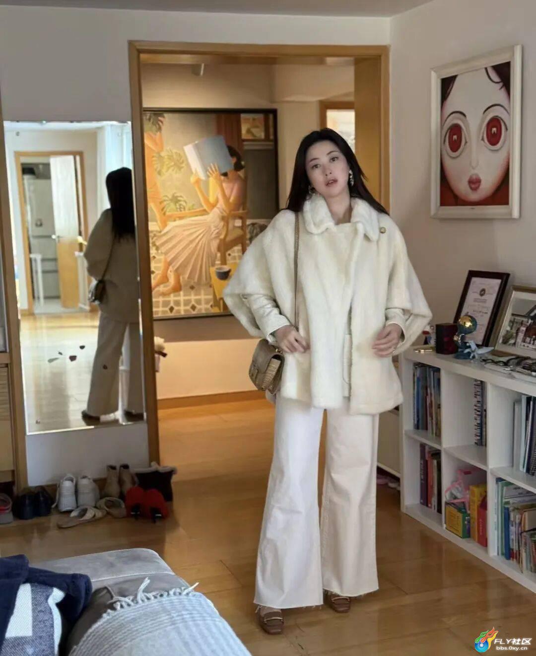 我发现她真的很爱这种草草毛毛外套,之前圣诞节这套白色毛毛外套+白裤子这套就好好看啊,很有古早富家千金范儿。