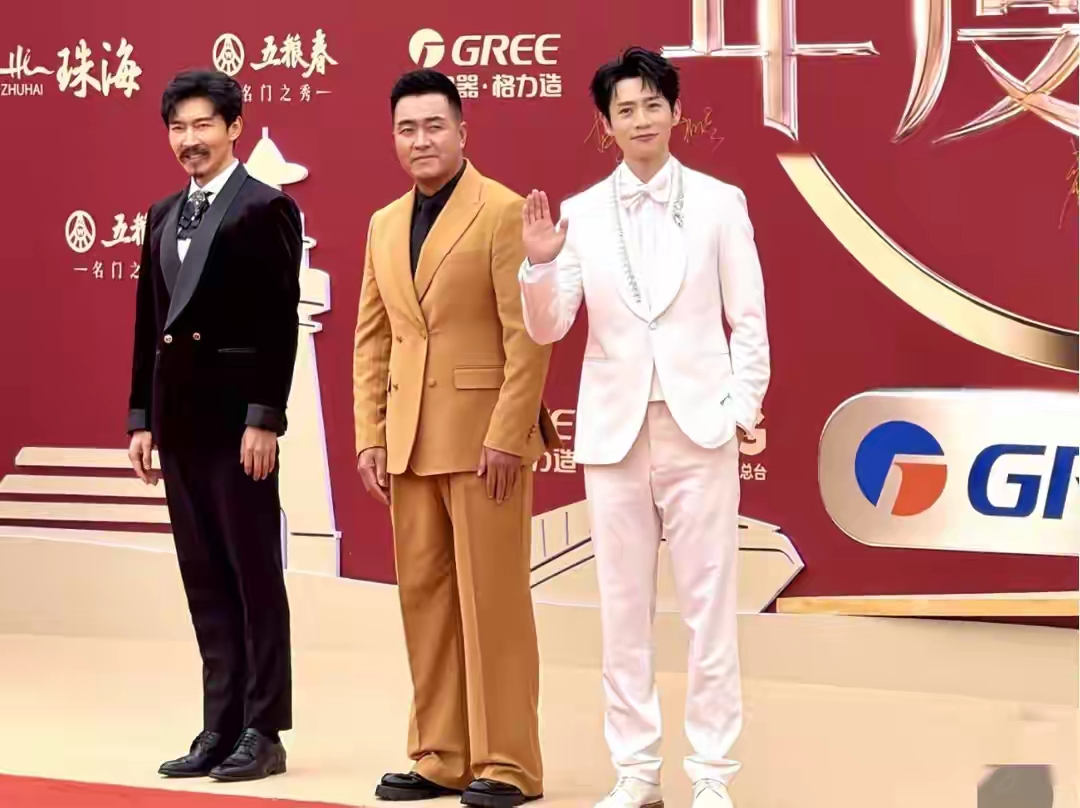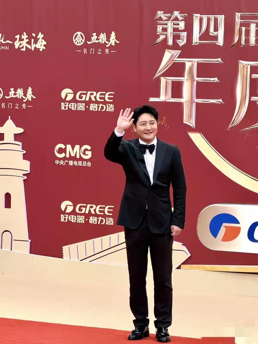 郭京飞穿西服,肚子挺大的,估计是最近吃得多没锻炼。