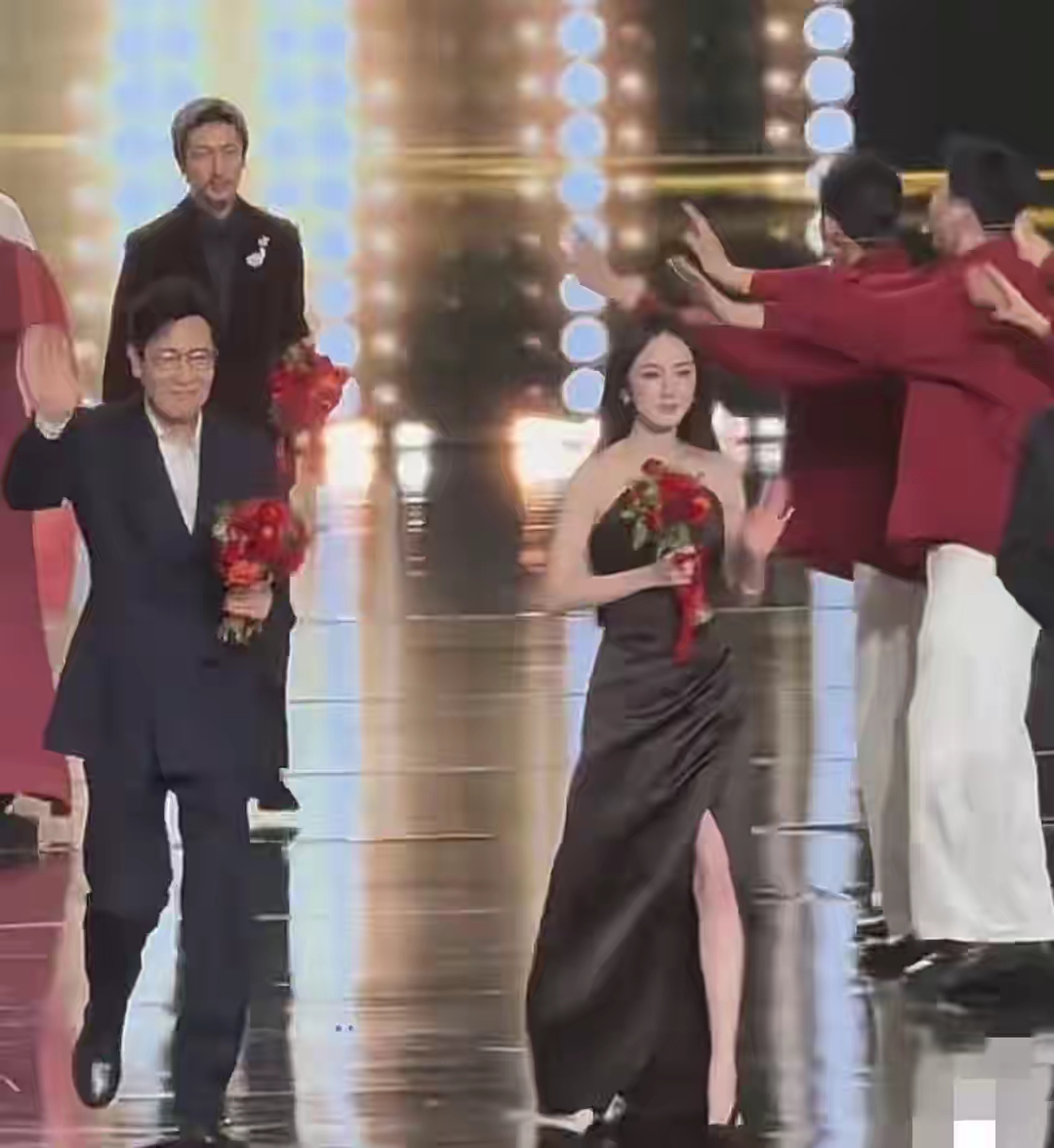 高圆圆和张鲁一一块走,她穿酒红色长裙,丸子头挺精神,张鲁一穿红褐色西装,胡子好像没刮干净。