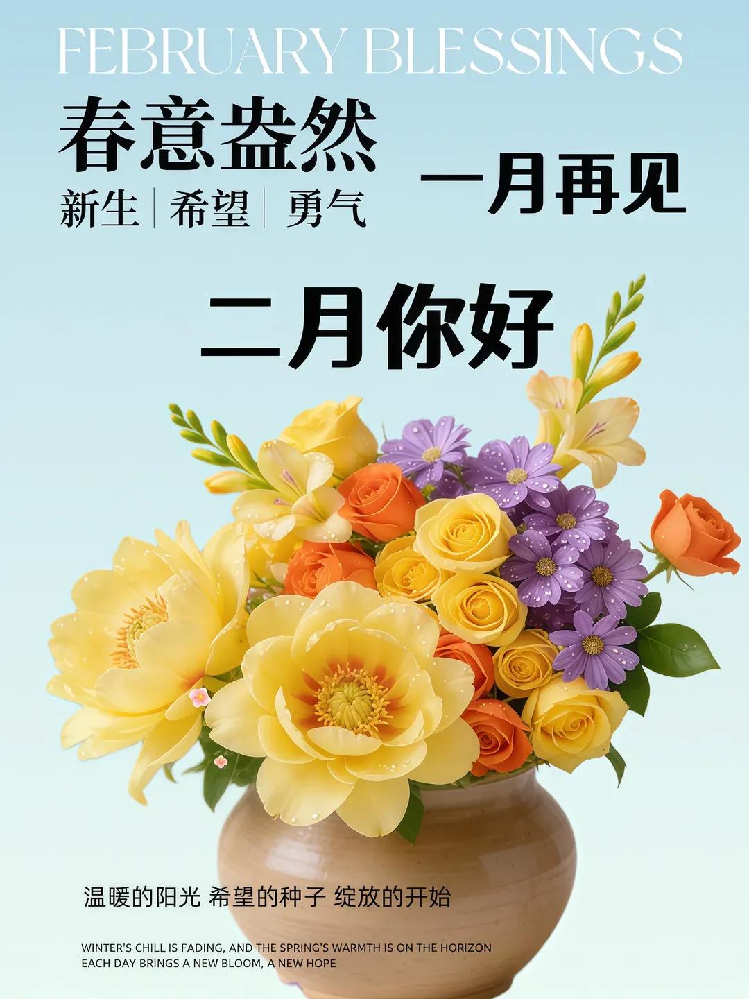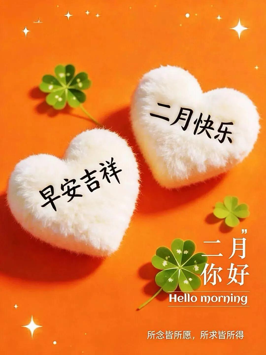 二月第一个早安送给你。愿有人问你粥可温,有人与你立清晨。晨光披肩,祝福上线。二月,愿你被世界温柔以待。早安。新的月份,愿你所念皆安暖,所遇皆良善。二月的问候,比冬日的暖阳更早抵达你。愿你一天好心情。今天,对在乎的人说声早安吧。二月的温暖,从分享开始。