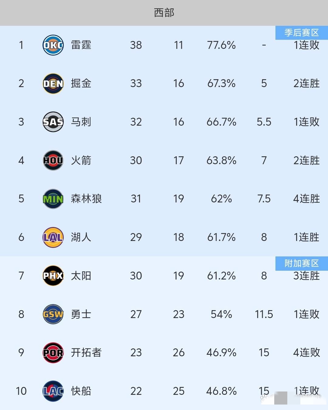 对照最新积分榜,西部2至7名的混乱程度堪称本赛季之最:掘金33胜16负升至第二,马刺32胜16负跌至第三,火箭30胜17负守住第四,森林狼31胜19负第五,湖人29胜18负第六,太阳30胜19负第七。彼此间最小胜场差仅0.5个,一场比赛就可能让排名发生连锁反应。这种混乱的本质,是中游球队阵容深度的提升与核心球员状态的波动——当黄蜂、森林狼等球队凭借团队韧性打出连胜,传统豪强稍有不慎就会被挤出前列。