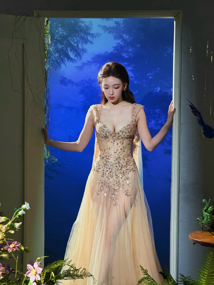 上半身的深V设计直接开叉到胸口,更绝是她还是真空上阵,尽显无敌曼妙的身材,下半身的纱裙还是透视的,程潇的美腿也是清晰可见。