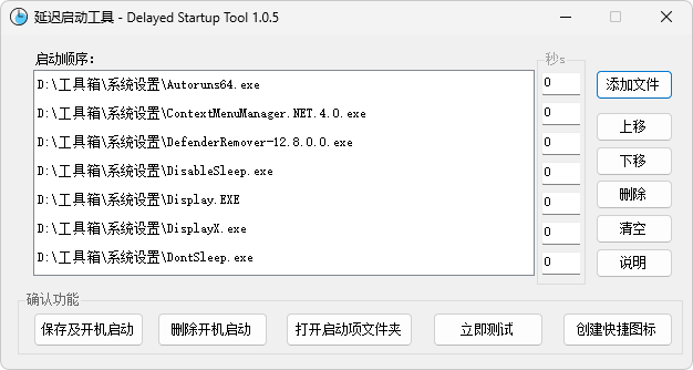 添加文件:点击“添加文件”按钮,选择要添加到启动顺序中的应用程序,后面的数字是延时的时间,单位秒。