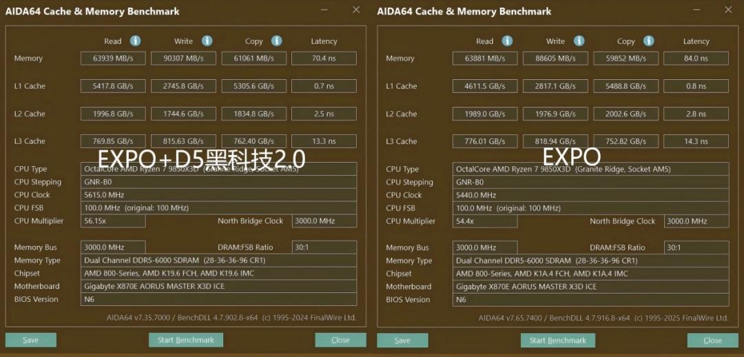 主板采用了18(110A)+2(110A)+2(60A)相供电设计,配备了四条DDR5内存插槽,最高支持9000+MT/s的内存频率。搭配技嘉主板专属的D5黑科技2.0后,我们手头的这两条16GB DDR5-6000MHz内存,在AIDA64中实测到读取速度63939MB/s,写入速度90307MB/s,复制速度61061MB/s,相较不开启D5黑科技2.0前,平均提升了2%,延迟也降低了16%。
