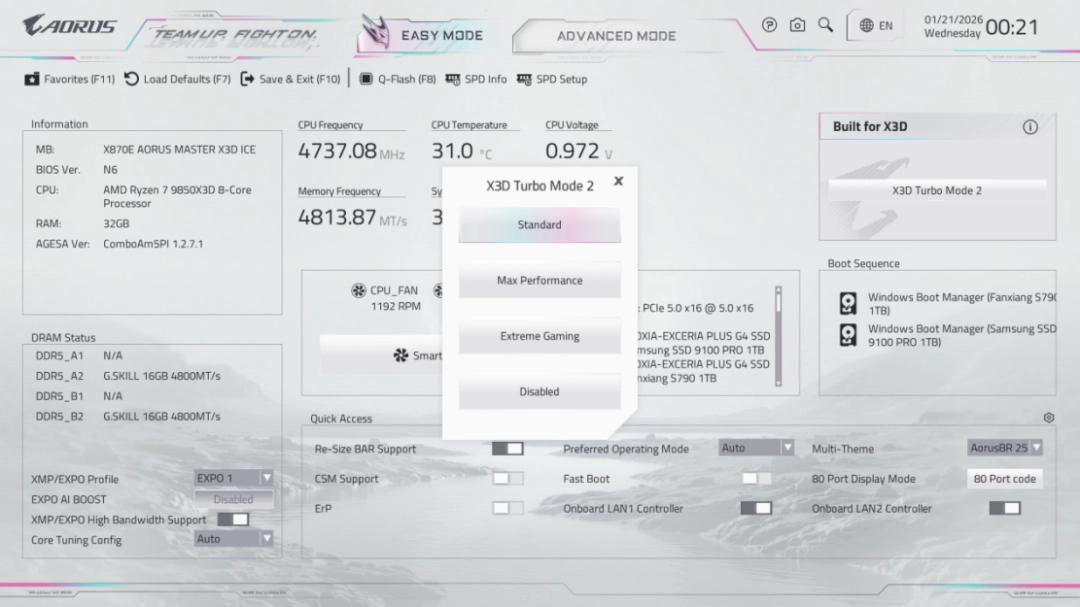 在如此多硬件堆料的基础上,这块技嘉X870E AORUS MASTER X3D ICE上还配备了技嘉独创的X3D Turbo模式2.0。顾名思义,开启该模式后这块主板能进一步提升X3D系列处理器的性能表现,玩家可在三种预设模式——标准、最大性能和极限游戏中任选其一,获得不同幅度的性能提升。