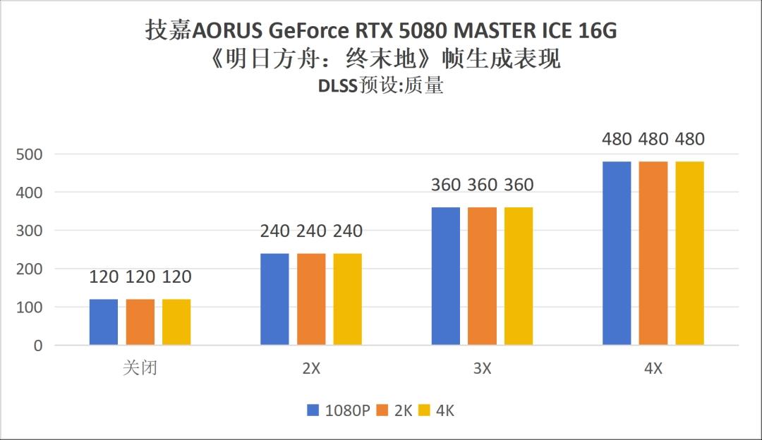 我们也实际测试了《明日方舟:终末地》在这块技嘉AORUS GeForce RTX 5080 MASTER ICE 16G显卡上的运行表现。但就像上面提到的,这块显卡的性能对《明日方舟:终末地》这样的二游来说绝对是溢出的,即便你在游戏中搭建了极为复杂的自动化项目,画面上同时有十多条生产线在运作,游戏画面也不会出现任何卡顿发热情况。我们测试了其在1080P、2K、4K分辨率下,开启最高画质和DLSS“质量”模式后,分别在关闭DLSS帧生成和开启2倍、3倍、4倍帧生成的情况下,游戏中角色跑图的帧数表现,结果就是每次都能稳定跑满游戏在不同帧生成档位下的帧数上限,完全没有任何负载压力。