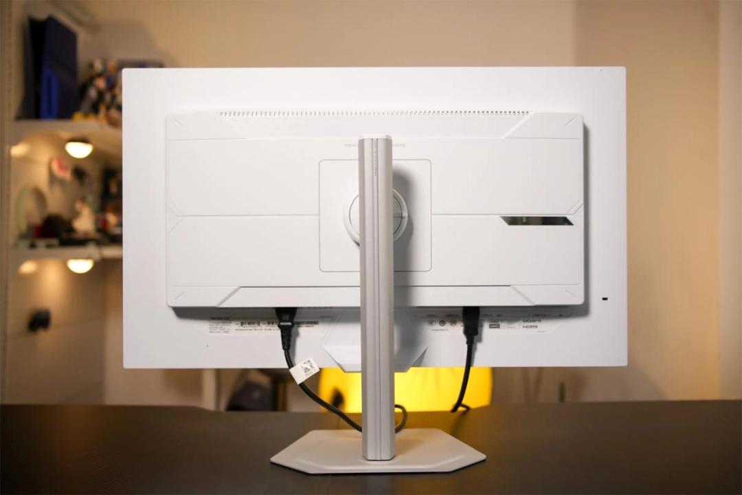 转到背部,也是一体化的纯白设计,表面用了线条纹理和品牌LOGO做点缀,简单利落地彰显其电竞显示器的定位。