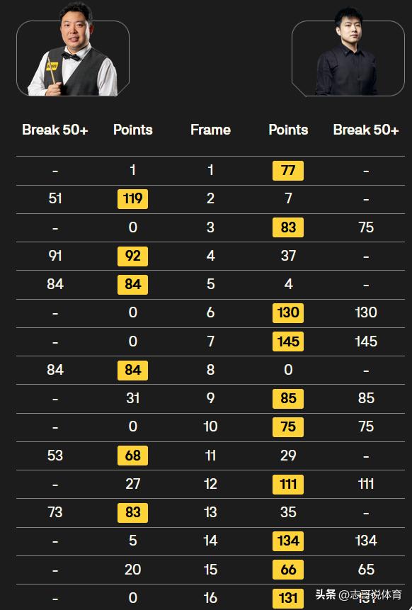 本场比赛第一阶段,两人打得难解难分,张安达虽然没有单杆破百,不过仍然是没有落后,两人大比分4-4打平。到了第二阶段,赵心童的状态明显更好,张安达越打越被动,赵心童动不动就是破百、50+的表现,还是成功10-6夺冠。