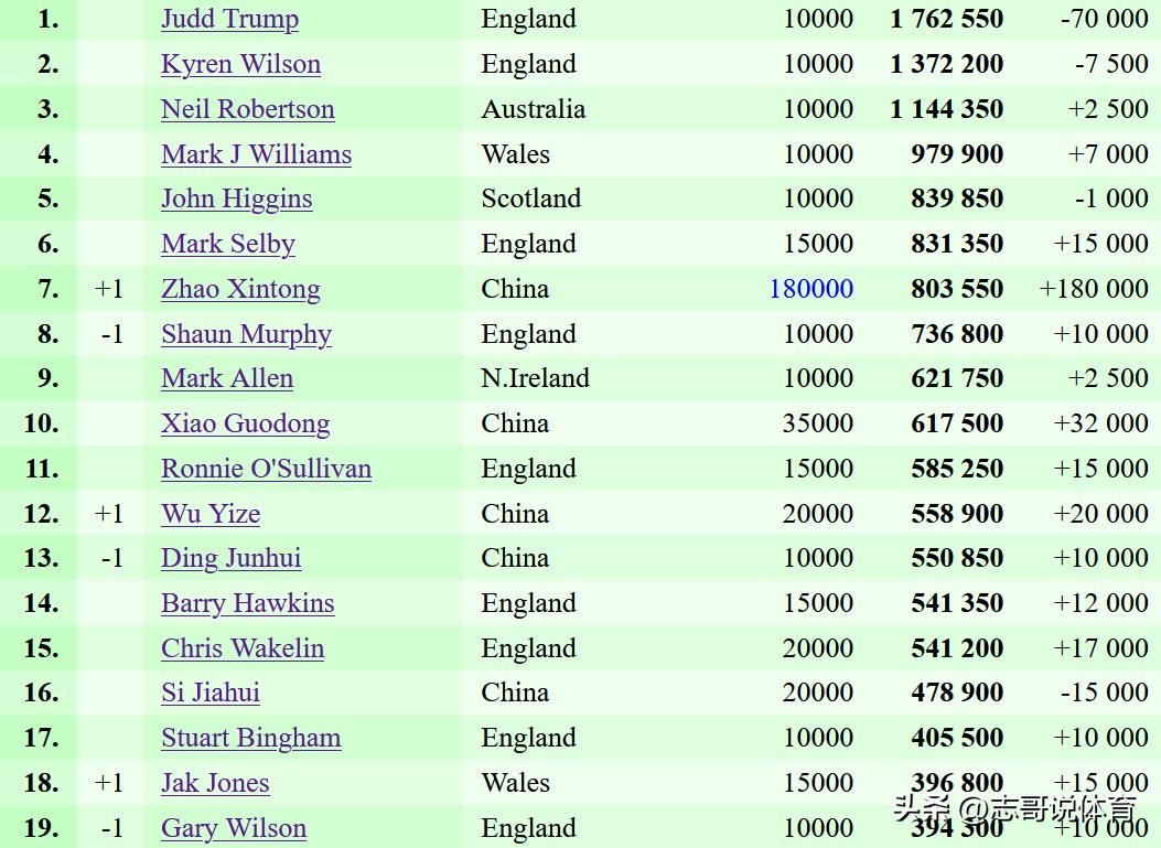 从最新的排名来看,TOP6没有变化,依然是:特鲁姆普、凯伦-威尔逊、尼尔-罗伯逊、马克-威廉姆斯、希金斯和塞尔比,赵心童则是反超了墨菲、升至第7位,吴宜泽升至第12位,丁俊晖下滑1位到到第13位。其余的TOP16球员没有变化!