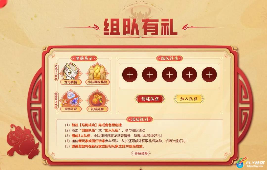 参与组队有礼活动,达成3人队伍,即可获取龙马表情包,以及新春小队活动等级,助力少侠更快获取活动奖励!