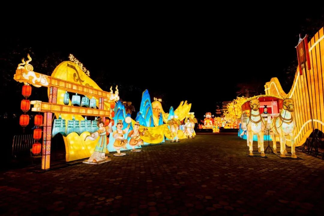 “秦汉长歌”以灯为笔,勾勒出长城的巍峨轮廓与兵马俑的肃穆阵列,一支骆驼商队仿佛正从丝绸之路的星夜中走来。