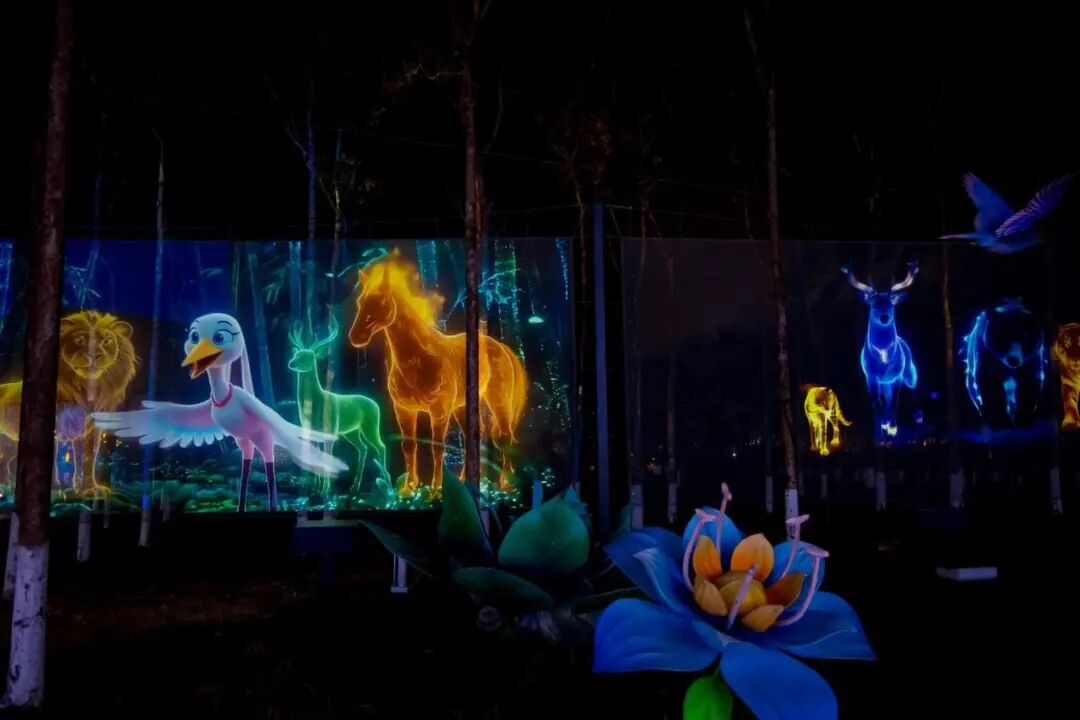 在主线之外,还藏匿着一处宁静的休止符——“绿野仙踪·生态和鸣”。走进这片区域,全息光影与雾森效果共同营造出一个现实与幻想交织的奇境,湾区的珍稀生灵以灯光艺术的形式“生活”于此,栩栩如生。