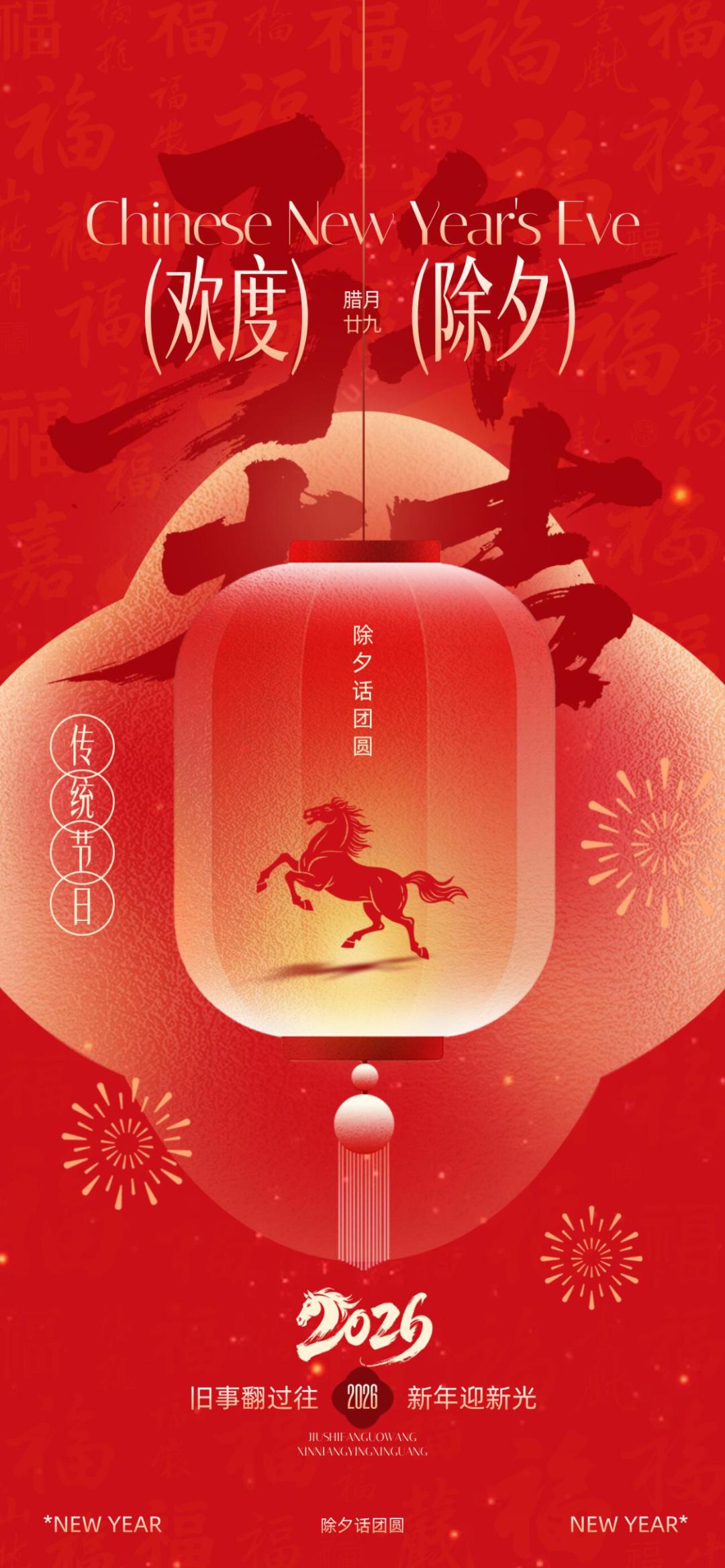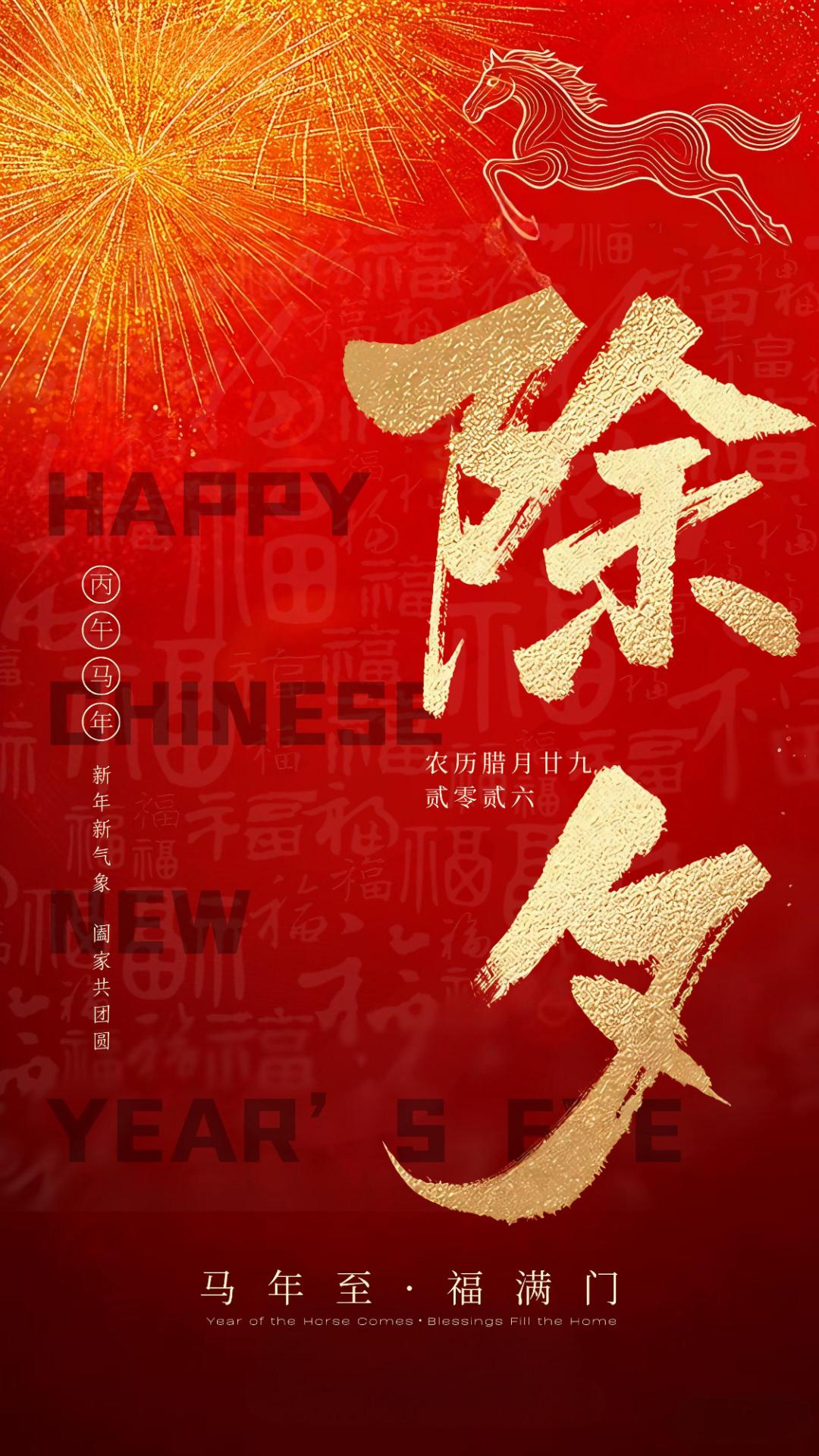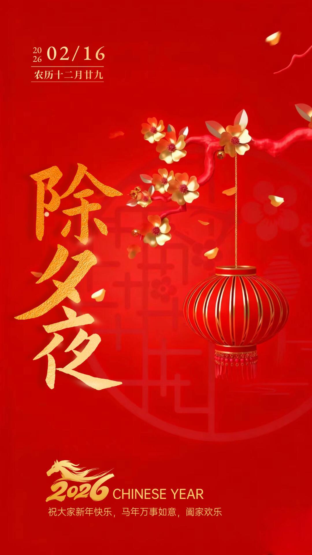 除夕到,新年好,钟声敲,旧岁除,福马呈祥,2026心想事成,祝您马年步步高升!今日除夕,归零,更新,重启,向上,发一条不一样的朋友圈,人人点赞!